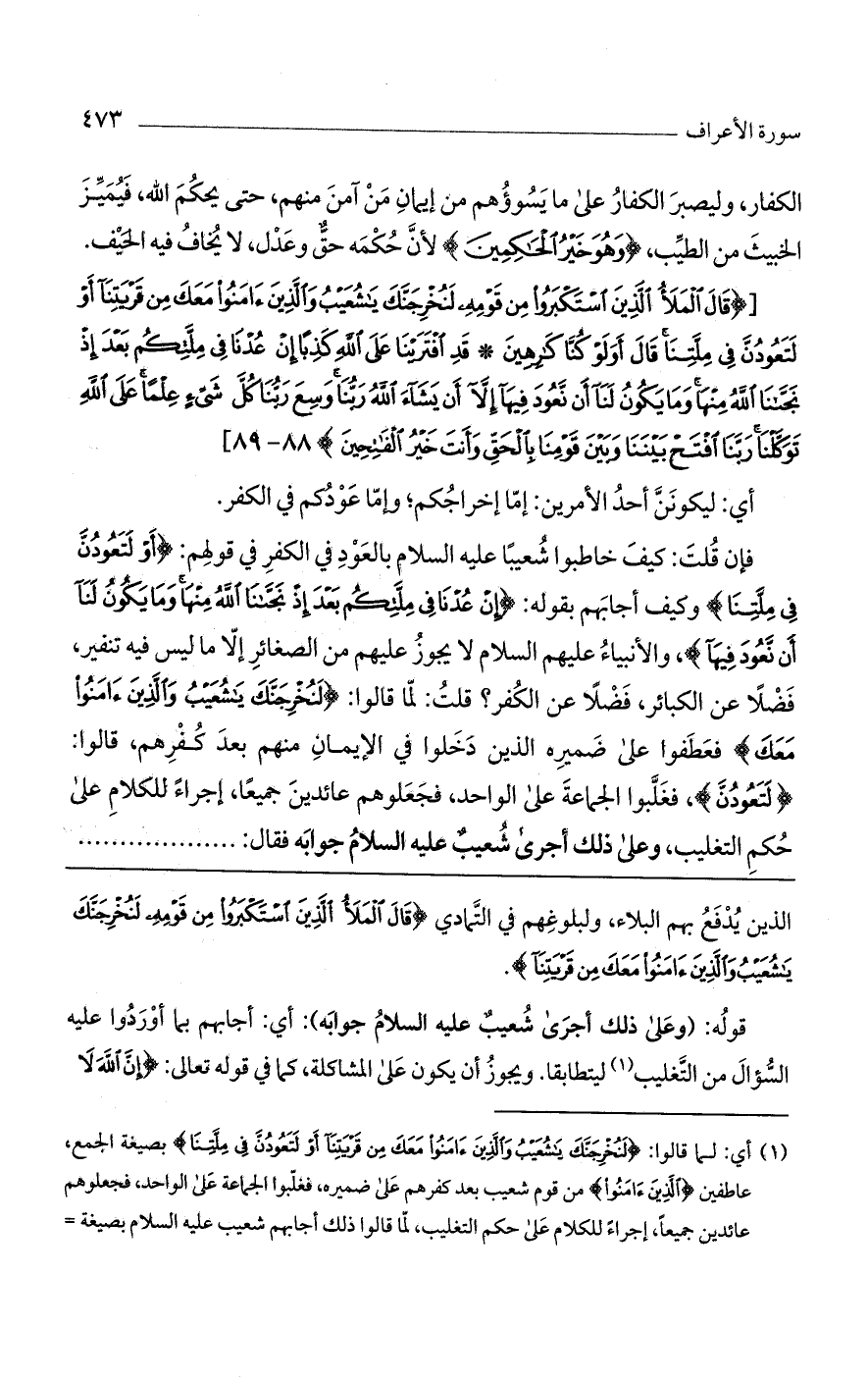 فإن قلت: كيف خاطبوا شعيباً عليه السلام بالعود في الكفر في قولهم: (أَوْ لَتَعُودُنَّ فِي مِلَّتِنا) وكيف أجابهم بقوله: (إِنْ عُدْنا فِي مِلَّتِكُمْ بَعْدَ إِذْ نَجَّانَا اللَّهُ مِنْها وَما يَكُونُ لَنا أَنْ نَعُودَ فِيها)، والأنبياء عليهم السلام لا يجوز عليهم من الصغائر إلا ما ليس فيه تنفير، فضلاً عن الكبائر، فضلاً عن الكفر؟ قلت: لما قالو: (لنخرجنك يا شعيب والذين آمنوا معك) فعطفوا على ضميره الذين دخلوا في الإيمان منهم بعد كفرهم، قالوا: (لتعودنّ)، فغلبوا الجماعة على الواحد، فجعلوهم عائدين جميعاً، إجراء للكلام على حكم التغليب، وعلى ذلك أجرى شعيبٌ عليه السلام جوابه فقال: