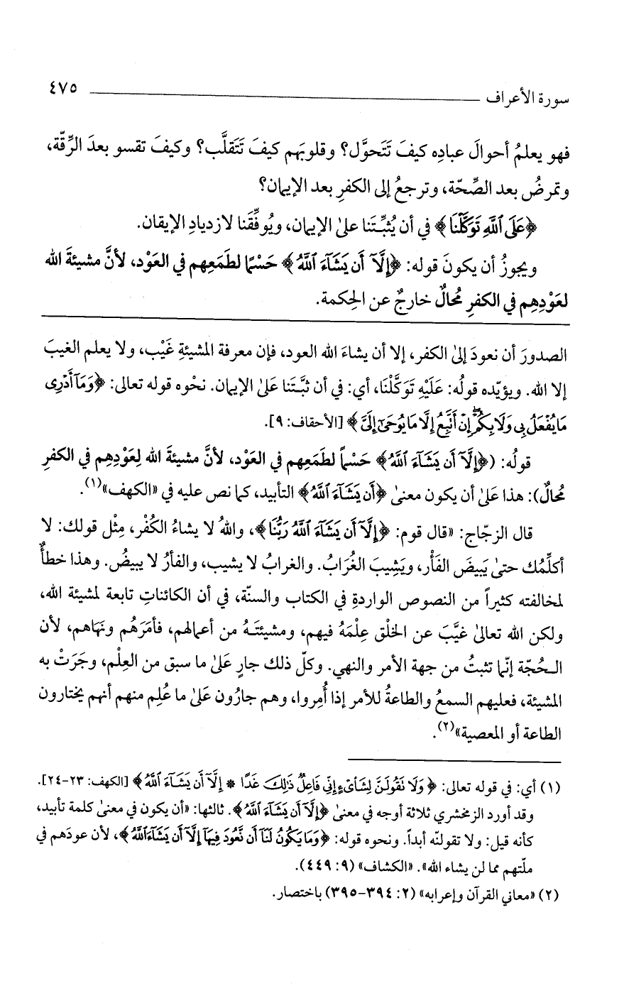 قوله: ((إلا أن يشاء الله) حسماً لطمعهم في العود، لأن مشيئة الله لعودهم في الكفر محال): هذا على أن يكون معنى (أن يشاء الله) التأبيد، كما نص عليه في "الكهف".