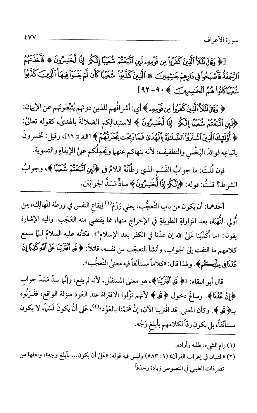 أحدهما: أن يكون من باب التعجب، يعني روم إيقاع النفس في ورطة المهالك، من أولي النهية، بعد المزاولة الطويلة في الإخراج منها، مما يقتضي منه العجب. وإليه الإشارة بقوله: "ما أكذبنا على الله إن عدنا في الكفر بعد الإسلام! ". فكأنه عليه السلام لما سمع كلامهم ما التفت إلى الجواب، وأنشأ التعجب من نفسه، قائلاً: (قد افترينا على الله كذباً إن عدنا في ملتكم). ولهذا قال: "كلاماً مستأنفاً فيه معنى التعجب".