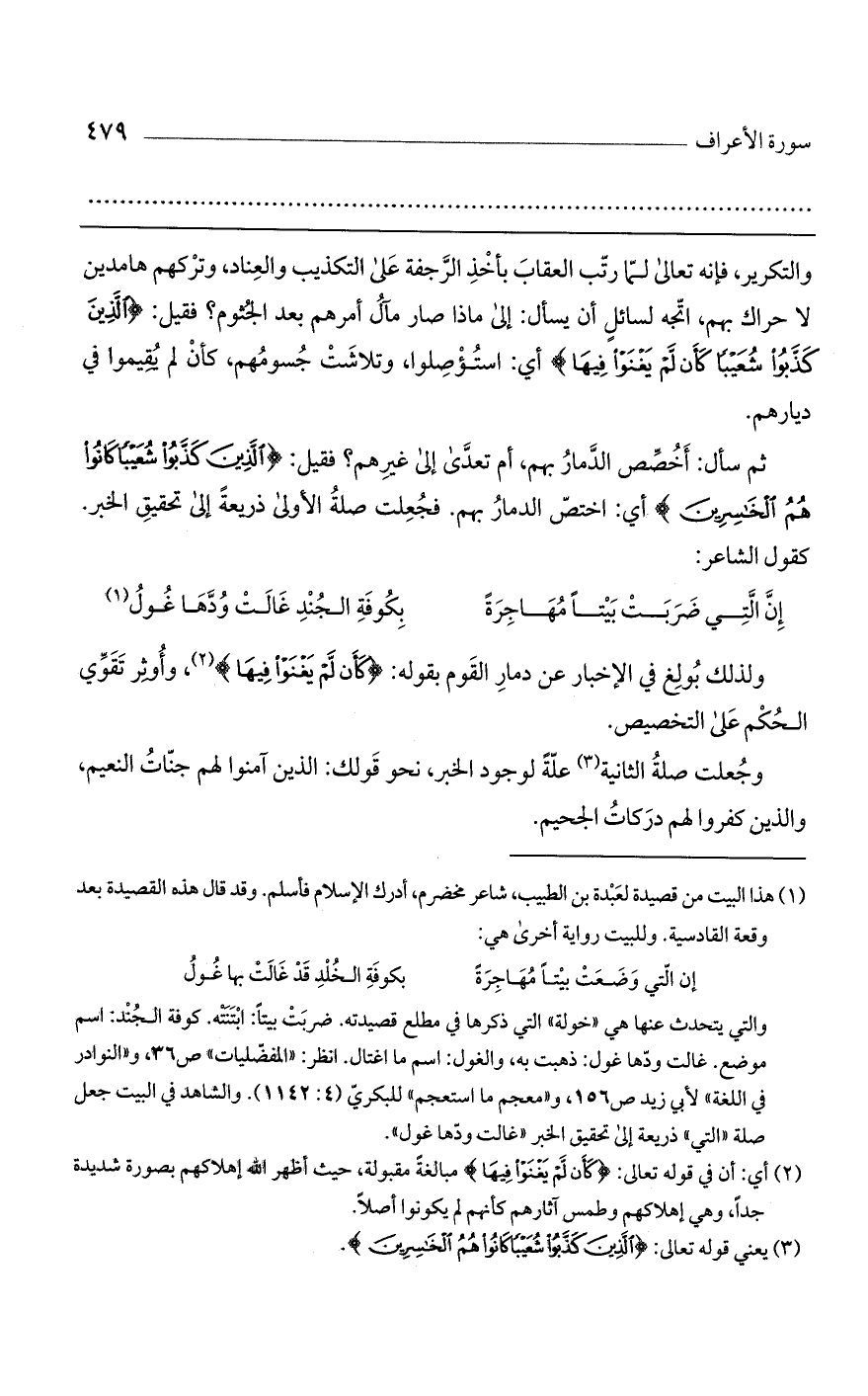 ثم سال: أخصص الدمار بهم، أم تعدى إلى غيرهم؟ فقيل: (الَّذِينَ كَذَّبُوا شُعَيْبًا كَانُوا هُمُ الخَاسِرِينَ) أي: اختص الدمار بهم. فجعلت صلة الأولى ذريعةً إلى تحقيق الخبر.