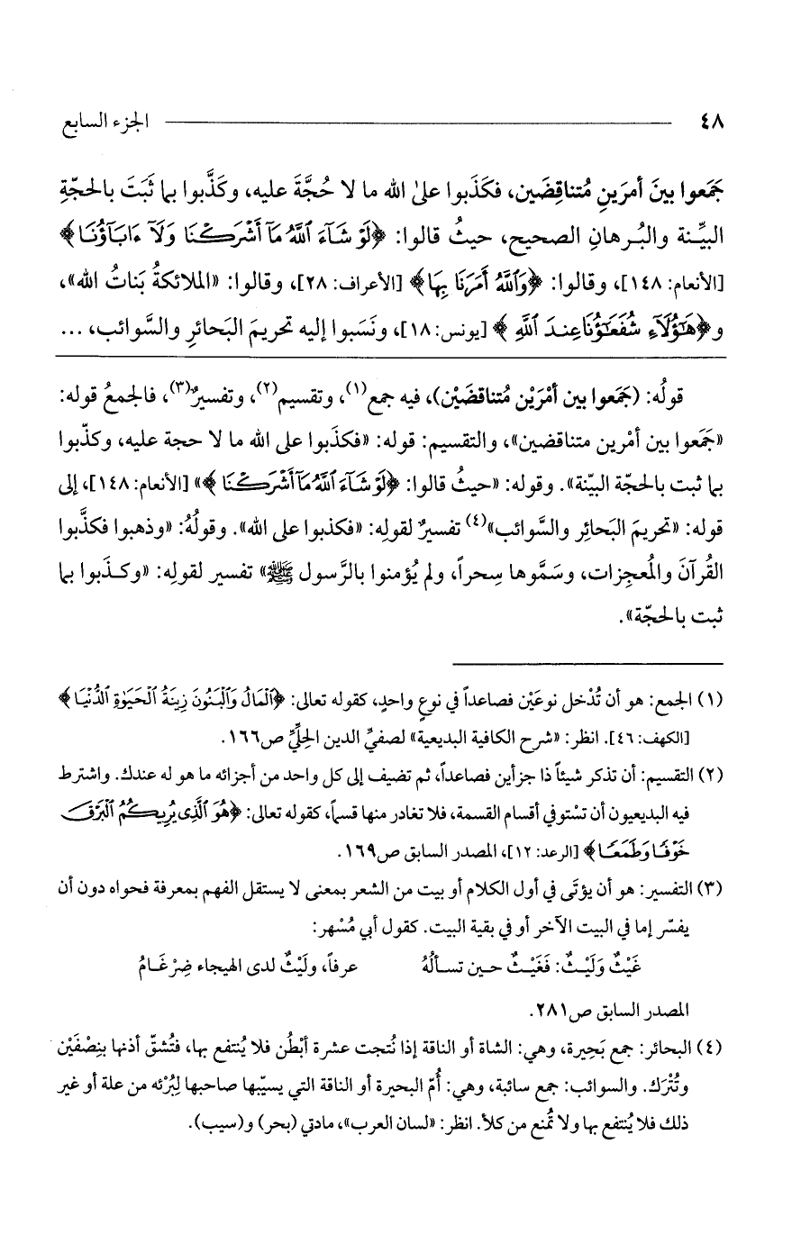 قوله: (جمعوا بين أمرين متناقضين)، فيه جمع، وتقسيم، وتفسير، فالجمع قوله: "جمعوا بين أمرين متناقضين"، والتقسيم: قوله: "فكذبوا على الله ما لا حجة عليه، وكذبوا بما ثبت بالحجة البينة". وقوله: "حيث قالوا: {لَوْ شَاءَ اللَّهُ مَا أَشْرَكْنَا {[الأنعام: 148]، إلى قوله: "تحريم البحائر والسوائب" تفسير لقوله: فكذبوا على الله". وقوله: "وذهبوا فكذبوا القرآن والمعجزات، وسموها سحراً، ولم يؤمنوا بالرسول صلى الله عليه وسلم" تفسير لقوله: "وكذبوا بما ثبت بالحجة".