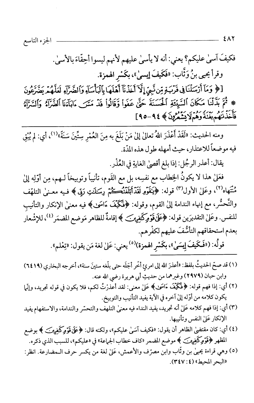 فعلى هذا لا يكون الخطاب مع نفسه، بل مع القوم، تأنيباً وتوبيخاً لهم، من أوله إلى منتهاه، وعلى الأول قوله: (يَا قَوْمِ لَقَدْ أَبْلَغْتُكُمْ رِسَالاتِ رَبِّي) فيه معنى التلهف والتحسر، مع إنهاء الندامة إلى القوم، وقوله: (فكيف أسي) فيه معنى الإنكار والتأنيث للنفس. وعلى التقديرين قوله: (على قوم كافرين) إقامة للظاهر موضع المضمر، للإشعار بعدم استحقاقهم التأسف عليهم لكفرهم.