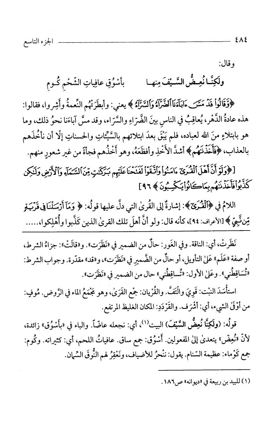 قوله: (ولكنا نعض السيف) البيت، أي: نجعله عاضاً. والباء في "بأسوق" زائدة، لأن "نعض" يتعدى إلى المفعولين. أسوق: جمع ساق. عافيات اللحم، أي: كثيراته. وكوم: جمع كوماء: عظيمة السنام. يقول: ننحر للأضياف، ونعقر لهم النوق السمان.