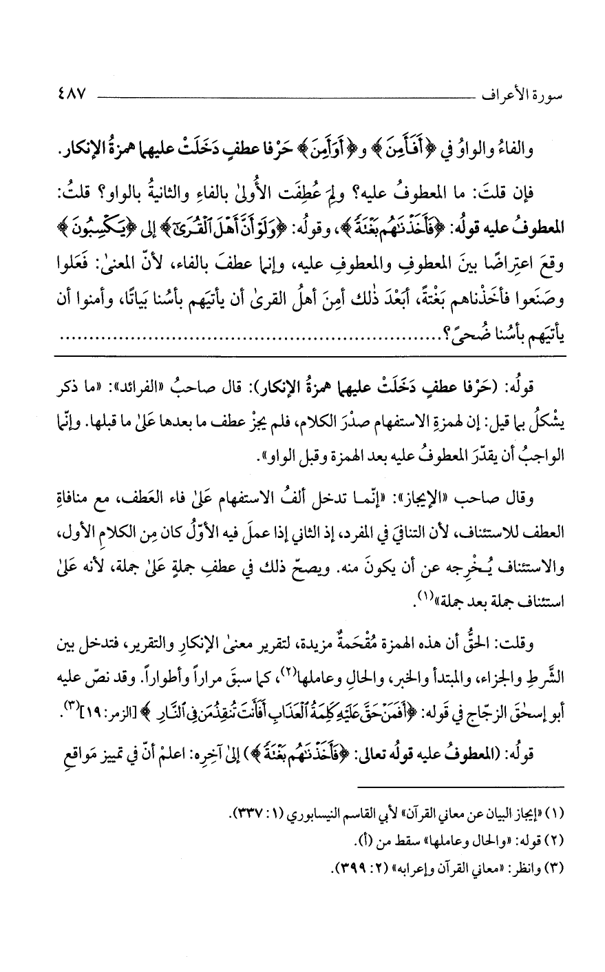 وقال صاحب "الإيجاز": "إنما تدخل ألف الاستفهام على فاء العطف، مع منافاة العطف للاستئناف، لأن التنافي في المفرد، إذ الثاني إذا عمل فيه الأول كان من الكلام الأول، والاستئناف يخرجه عن أن يكون منه. ويصح ذلك في عطف جملةٍ على جملة، لأنه على استئناف جملة بعد جملة".