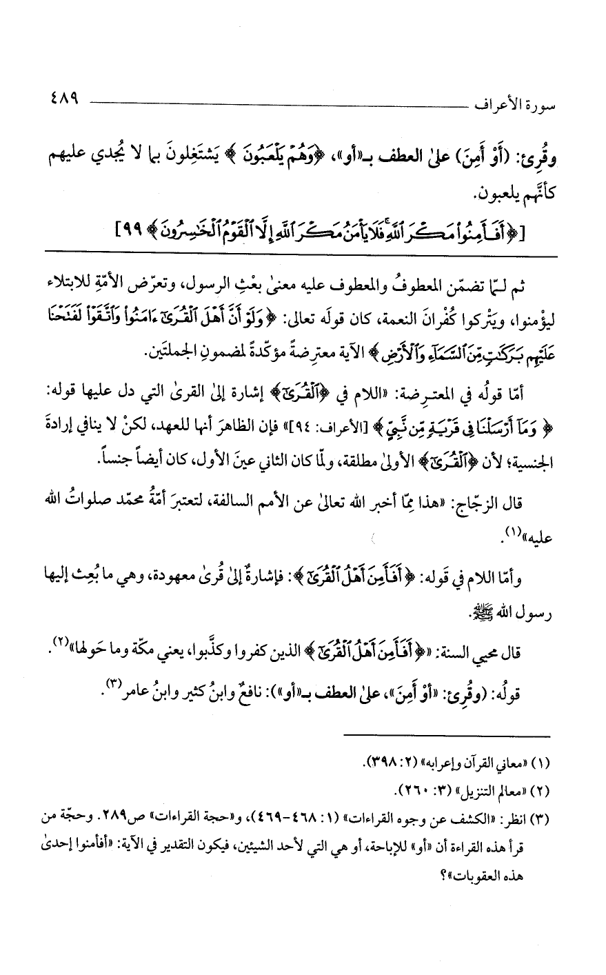 أما قوله في المعترضة: "اللام في (القرى) إشارة إلى القرى التي دل عليها قوله: (ومَا أَرْسَلْنَا فِي قَرْيَةٍ مِّن نَّبِيٍّ) [الأعراف: 94] " فإن الظاهر أنها للعهد، لكن لا ينافي إرادة الجنسية؛ لأن (القرى) الأولى مطلقة، ولما كان الثاني عين الأول، كان أيضًا جنساً.