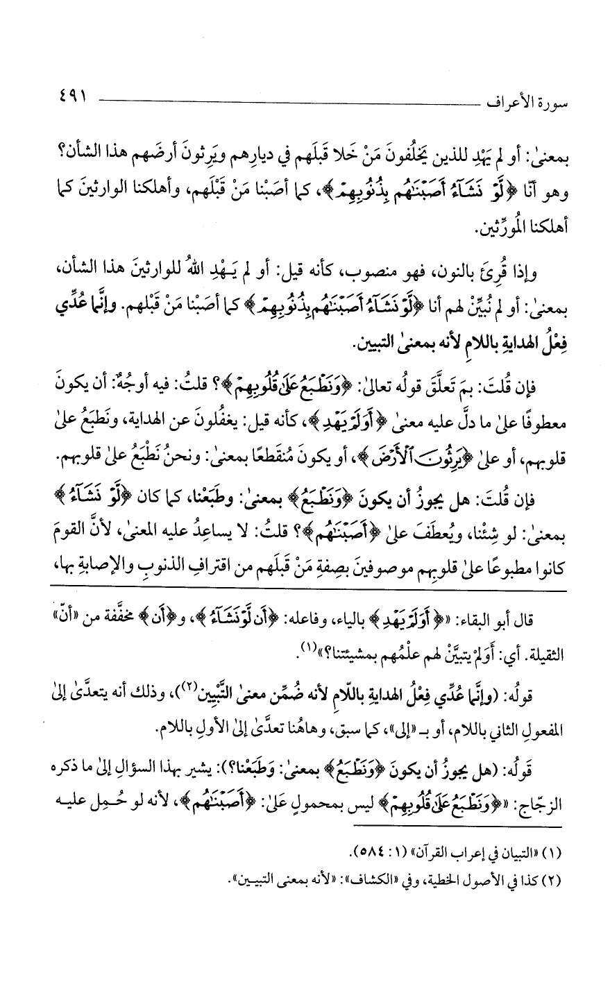 فإن قلت: هل يجوز أن يكون (وَنَطْبَعُ) بمعنى وطبعنا، كما كان (لَوْ نَشاءُ) بمعنى: لو شئنا، ويعطف على (أصبناهم)؟ قلت: لا يساعد عليه المعنى، لأن القوم كانوا مطبوعاً على قلوبهم موصوفين بصفة من قبلهم من اقتراف الذنوب والإصابة بها،