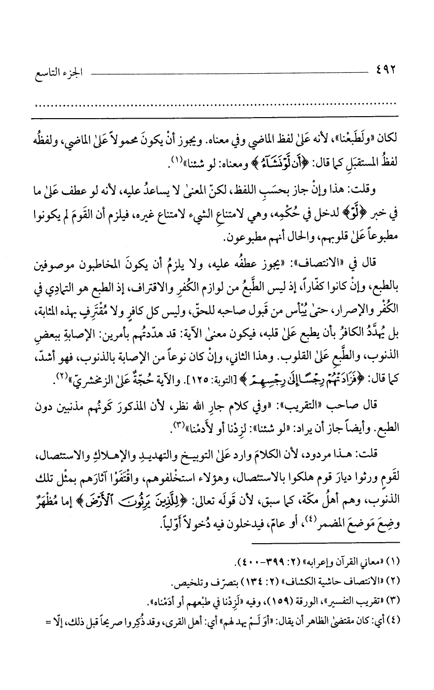 وقلت: هذا وإن جاز بحسب اللفظ، لكن المعنى لا يساعد عليه، لأنه لو عطف على ما في خبر (لو) لدخل في حكمه، وهي لامتناع الشيء لامتناع غيره، فيلزم أن القوم لم يكونوا مطبوعاً على قلوبهم، والحال أنهم مطبوعون.