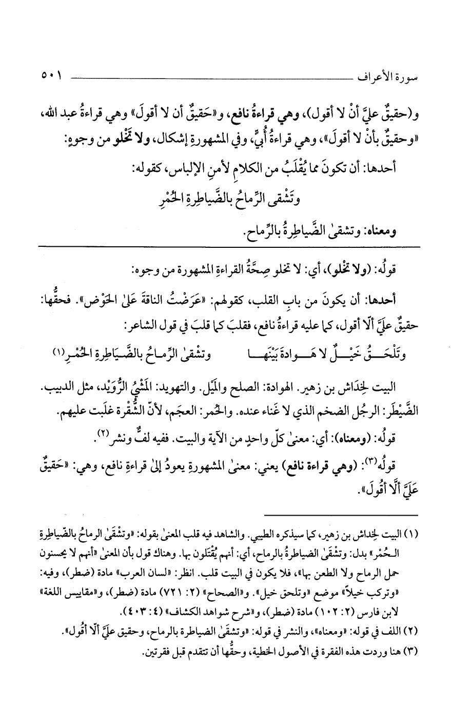 (وحقيقٌ علي أن لا أقول)، وهي قراءة نافع، و"حقيقٌ أن لا أقول" وهي قراءة عبد الله، "وحقيقٌ بأن لا أقول"، وهي قراءة أُبيّ وفي المشهورة إشكال، ولا تخلو من وجوهٍ: