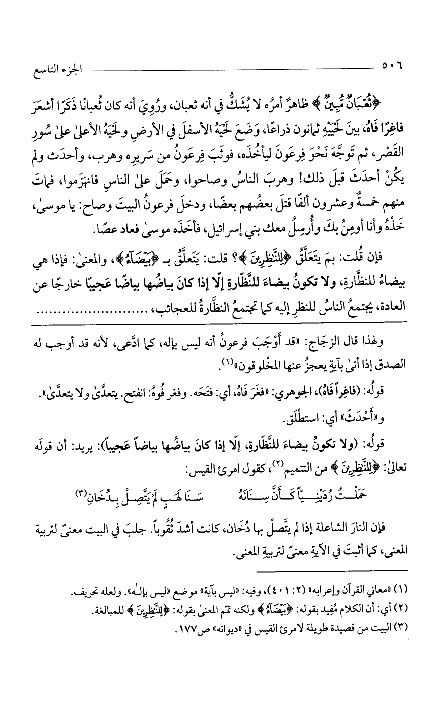 فإن قلت: بم يتعلق (لِلنَّاظِرِينَ)؟ قلت يتعلق بـ (بيضاء)، والمعنى: فإذا هي بيضاء للنظارة، ولا تكون بيضاء للنظارة إلا إذا كان بياضها بياضاً عجيباً خارجاً عن العادة، يجتمع الناس للنظر إليه كما تجتمع النظارة للعجائب، .....
