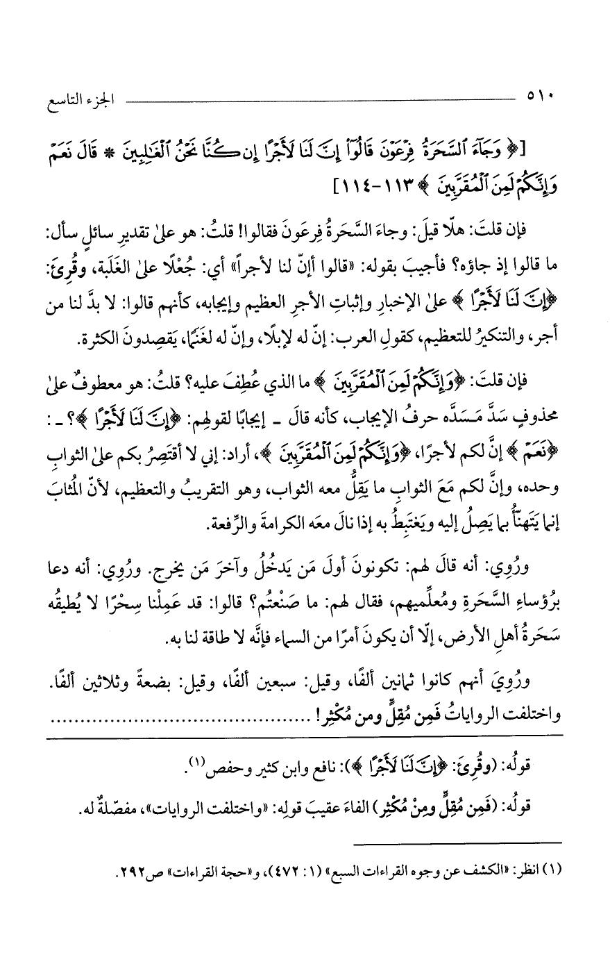فإن قلت: هلا قيل: وجاء السحرة فرعون فقالوا! قلت: هو على تقديرٍ سائلٍ سأل: ما قالوا إذ جاءوه؟ فأجيب بقوله: "قالُوا إِنَّ لَنا لَأَجْراً" أي: جُعلاً على الغلبة، وقرئ: (إن لنا لأجراً) على الإخبار وإثبات الأجر العظيم وإيجابه، كأنهم قالوا: لا بد لنا من أجر، والتنكير للتعظيم، كقول العرب: إنّ له لإبلاً، وإنّ له لغنماً، يقصدون الكثرة.