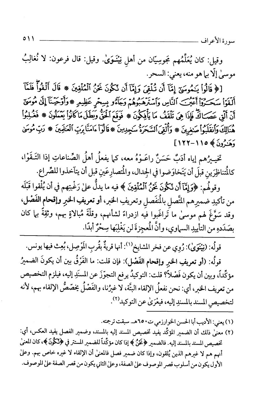 وقولهم: (وَإِمَّا أَنْ نَكُونَ نَحْنُ الْمُلْقِينَ) فيه ما يدل على رغبتهم في أن يلقوا قبله من تأكيد ضميرهم المتصل بالمنفصل وتعريف الخبر، أو تعريف الخبر وإقحام الفصل، وقد سوَّغ لهم موسى ما تراغبوا فيه ازدراء لشأنهم، وقلة مبالاةٍ بهم، وثقةً بما كان بصدده من التأييد السماوي، وأنّ المعجزة لن يغلبها سحر أبداً.