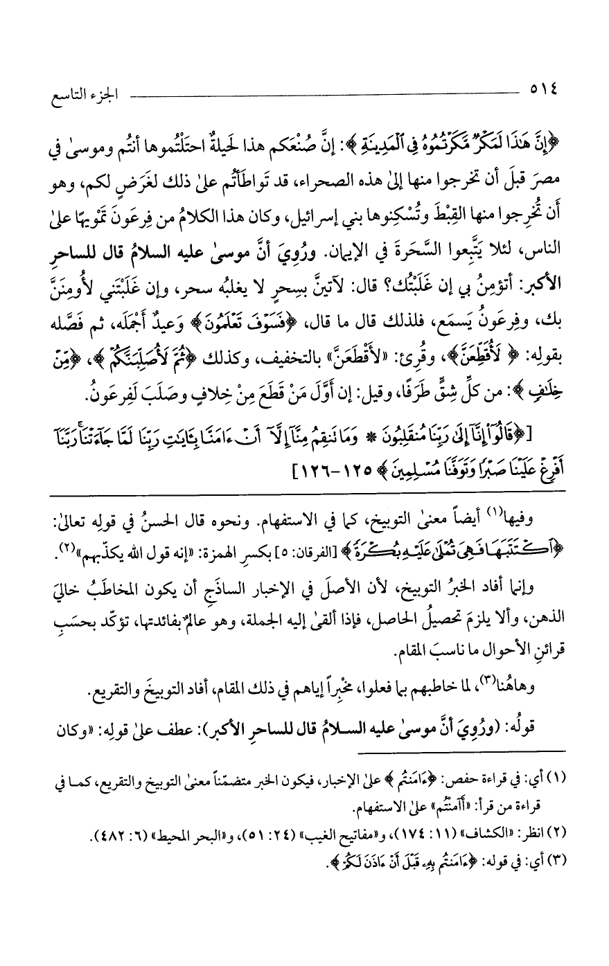 (إِنَّ هذا لَمَكْرٌ مَكَرْتُمُوهُ فِي الْمَدِينَةِ): إن صنعكم هذا لحيلةٌ احتلتموها أنتم وموسى في مصر قبل أن تخرجوا منها إلى هذه الصحراء، قد تواطأتم على ذلك لغرضٍ لكم، وهو أن تخرجوا منها القبط وتسكنوها بني إسرائيل، وكان هذا الكلام من فرعون تمويهاً على الناس لئلا يتبعوا السحرة في الإيمان. وروي أن موسى عليه السلام قال للساحر الأكبر: أتؤمن بي إن غلبتك؟ قال لآتين بسحر لا يغلبه سحر، وإن غلبتني لأومنن بك، وفرعون يسمع، فلذلك قال ما قال، (فَسَوْفَ تَعْلَمُونَ) وعيدٌ أجمله، ثم فصله بقوله: (لَأُقَطِّعَنَّ)، وقرئ: "لأقطعن" بالتخفيف، وكذلك (ثُمَّ لَأُصَلِّبَنَّكُمْ مِنْ خِلافٍ): من كل شق طرفاً، وقيل: إن أوّل من قطع من خلاف وصلب لفرعون.