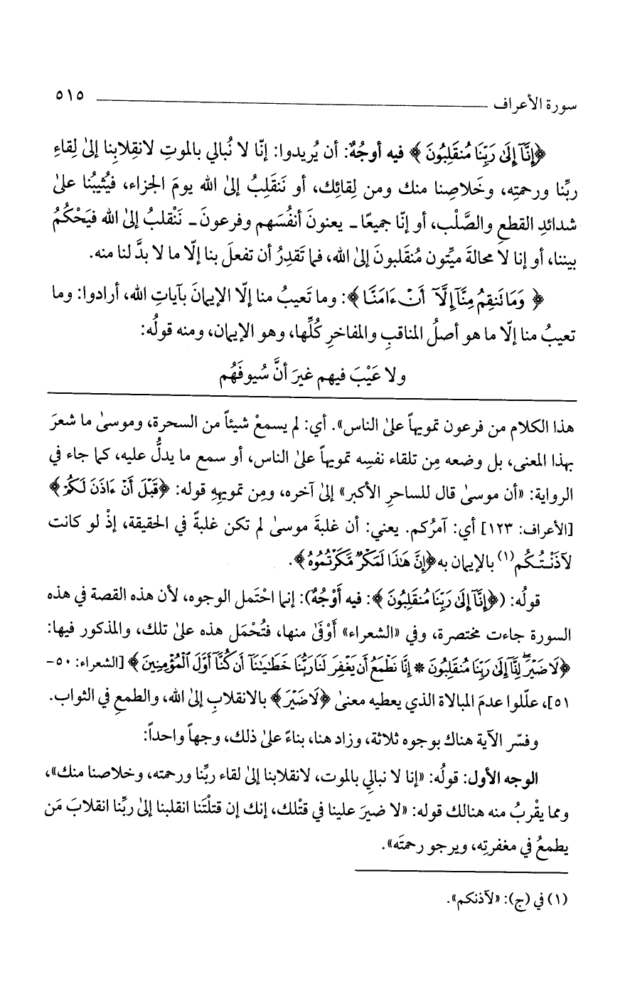 قوله: ((إنا إلى ربنا منقلبون): فيه أوجه): إنما احتمل الوجوه، لأن هذه القصة في هذه السورة جاءت مختصرة، وفي "الشعراء" أو في منها، فتحمل هذه على تلك، والمذكور فيها: (لا ضَيْرَ إنَّا إلَى رَبِّنَا مُنقَلِبُونَ * إنَّا نَطْمَعُ أَن يَغْفِرَ لَنَا رَبُّنَا خَطَايَانَا أَن كُنَّا أَوَّلَ المُؤْمِنِينَ) [الشعراء: 50 - 51]، عللوا عدم المبالاة الذي يعطيه معنى (لا ضير) بالانقلاب إلى الله، والطمع في الثواب.