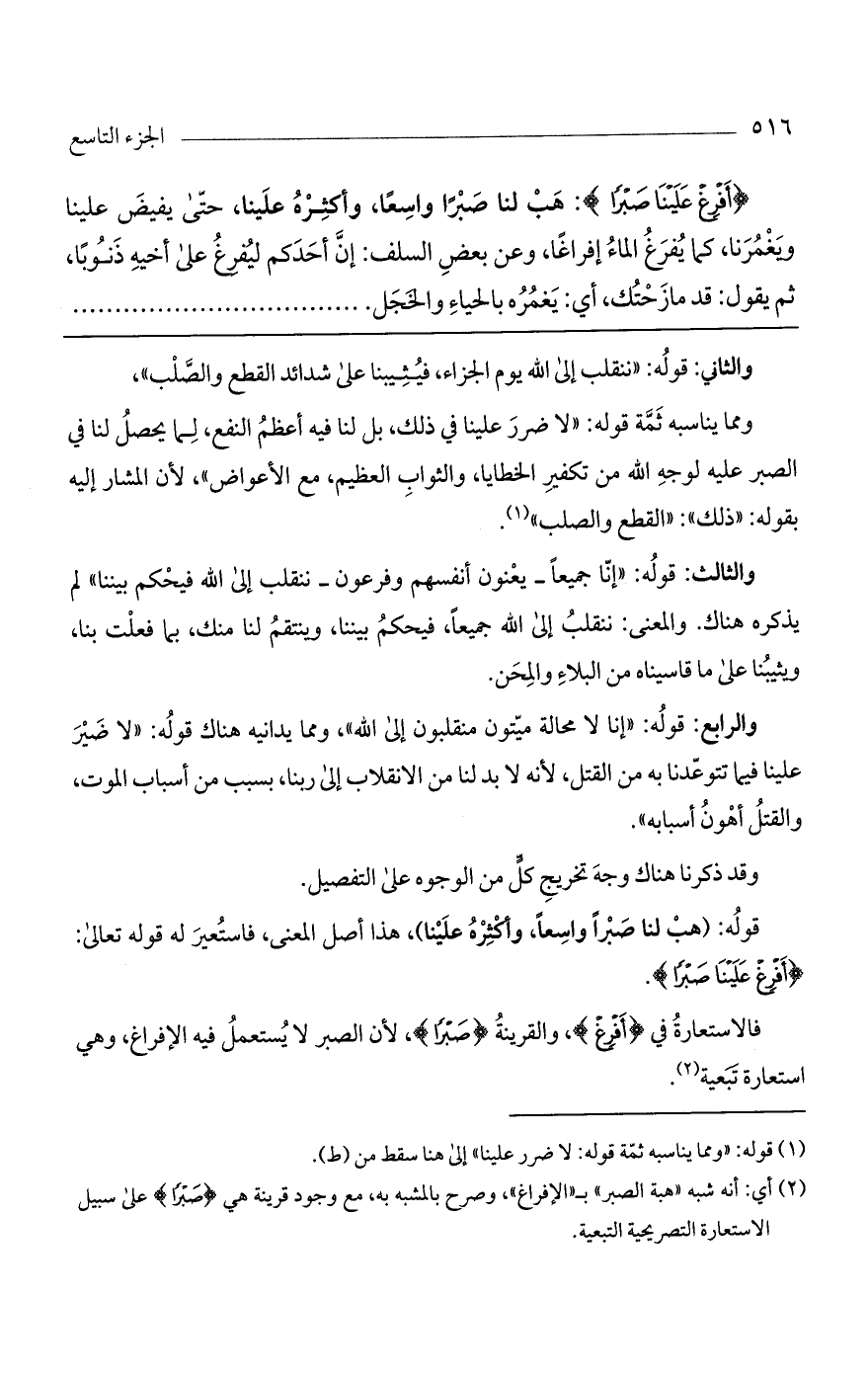 قوله: (هب لنا صبراً واسعاً، وأكثره علينا)، هذا أصل المعنى، فاستعير له قوله تعالى: (أفرغ علينا صبراً).