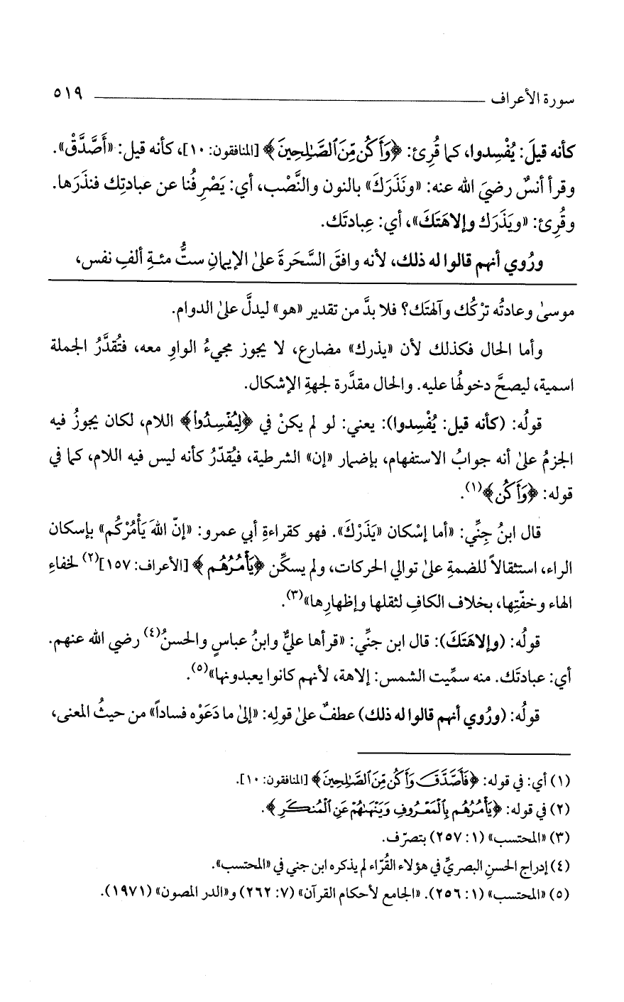 قال ابن جني: "أما إسكان "يذرك". فهو كقراءة أبي عمرو: "إن الله يأمركم" بإسكان الراء، استثقالاً للضمة على توالي الحركات، ولم يسكن (يأمرهم) [الأعراف: 157] لخفاء الهاء وخفتها، بخلاف الكاف لثقلها وإظهارها".