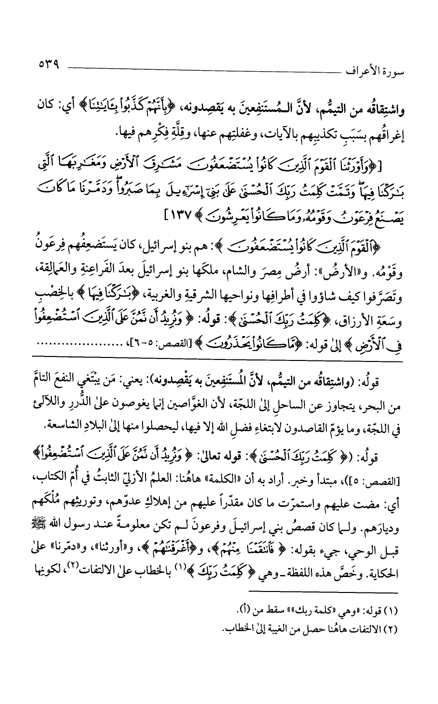 قوله: ((كَلِمَتُ رَبِّكَ الحُسْنَى): قوله تعالى: (ونُرِيدُ أَن نَّمُنَّ عَلَى الَّذِينَ اسْتُضْعِفُوا) [القصص: 5])، مبتدأ وخبر. أراد به أن "الكلمة" هاهنا: العلم الأزلي الثابت في أم الكتاب، أي: مضت عليهم واستمرت ما كان مقدراً عليهم من إهلاك عدوهم، وتوريثهم ملكهم وديارهم. ولما كان قصص بني إسرائيل وفرعون لم تكن معلومةً عند رسول الله صلي الله عليه وسلم قبل الوحي، جيء بقوله: (فانتقمنا منهم)، و (أغرقناهم)، و"أورثنا"، و"دمرنا" على الحكاية. وخص هذه اللفظة - وهي (كلمت ربك) بالخطاب على الالتفات، لكونها