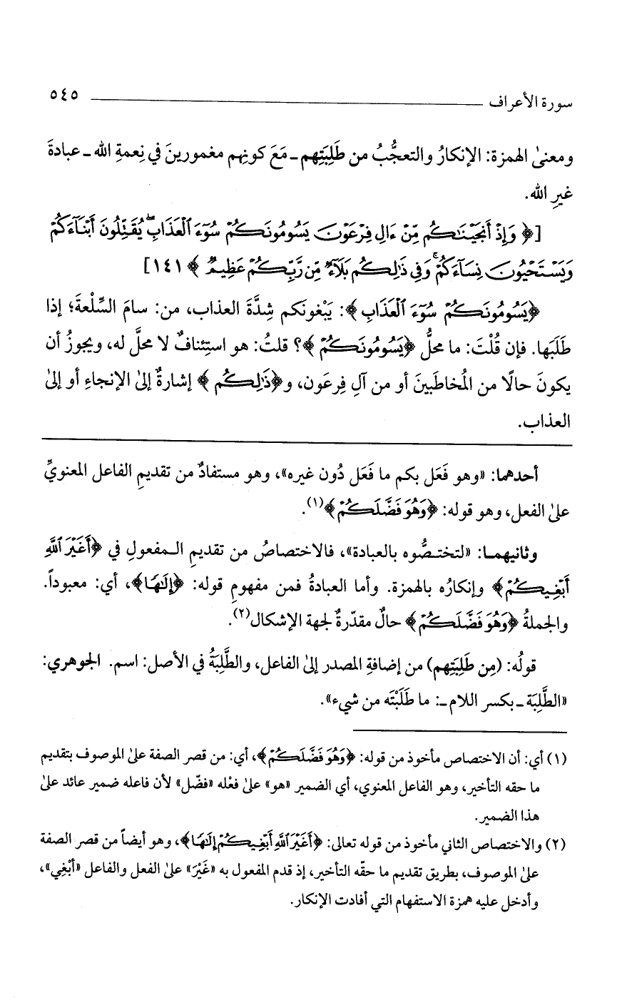 وثانيهما: "لتختصوه بالعبادة"، فالاختصاص من تقديم المفعول في (أغير الله أبغيكم) وإنكاره بالهمزة. وأما العبادة فمن مفهوم قوله: (إلها)، أي: معبوداً. والجملة (وهو فضلكم) حال مقدرة لجهة الإشكال.