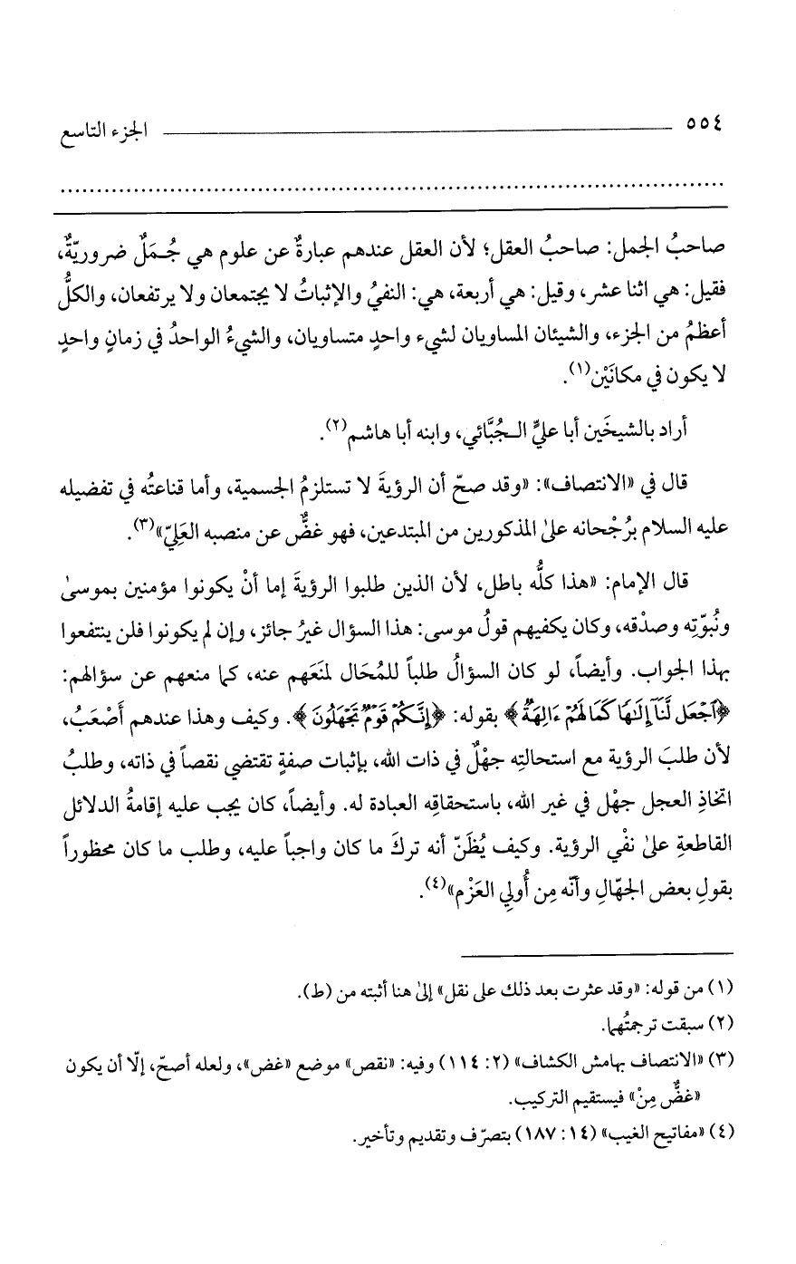 صاحب الجمل: صاحب العقل؛ لأن العقل عندهم عبارة عن علوم هي جمل ضرورية، فقيل: هي اثنا عشر، وقيل: هي أربعة، هي: النفي والإثبات لا يجتمعان ولا يرتفعان، والكل أعظم من الجزء، والشيئان المساويان لشيء واحدٍ متساويان، والشيء الواحد في زمانٍ واحدٍ لا يكون في مكانين.