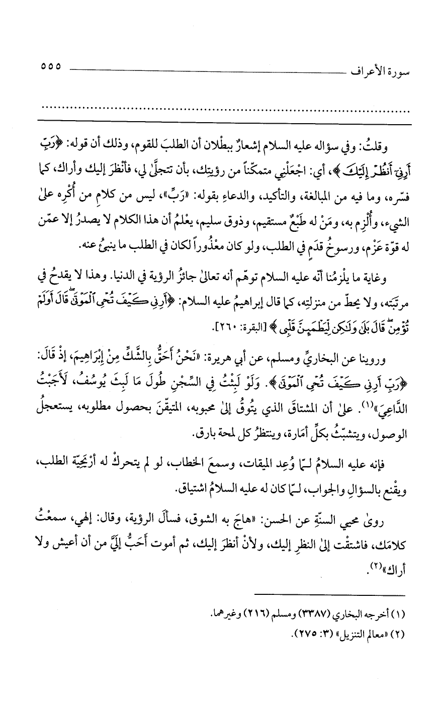 وقلت: وفي سؤاله عليه السلام إشعار ببطلان أن الطلب للقوم، وذلك أن قوله: (رَبِّ أَرِنِي أَنظُرْ إلَيْكَ)، أي: اجعلني متمكناً من رؤيتك، بأن تتجلى لي، فأنظر إليك وأراك، كما فسره، وما فيه من المبالغة، والتأكيد، والدعاء بقوله: "رب"، ليس من كلام من أكره على الشيء، وألزم به، ومن له طبع مستقيم، وذوق سليم، يعلم أن هذا الكلام لا يصدر إلا عمن له قوة عزم، ورسوخ قدمٍ في الطلب، ولو كان معذوراً لكان في الطلب ما ينبئ عنه.