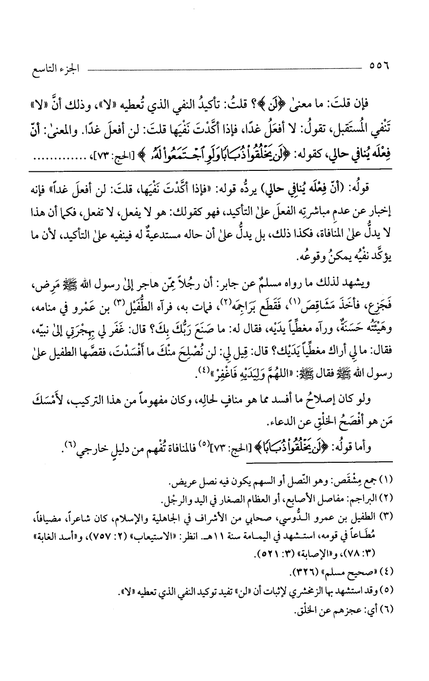 فإن قلت: ما معنى (لَنْ)؟ قلت: تأكيد النفي الذي تعطيه «لا» وذلك أن «لا» تنفى المستقبل، تقول: لا أفعل غداً، فإذا أكدت نفيها قلت: لن أفعل غداً. والمعنى: أنّ فعله ينافي حالي، كقوله: (لَنْ يَخْلُقُوا ذُباباً وَلَوِ اجْتَمَعُوا لَهُ) [الحج: 73]، .......