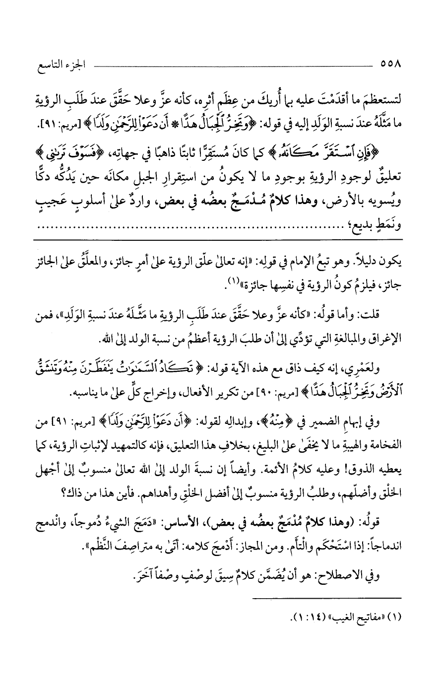 وفي إبهام الضمير في (منه)، وإبداله لقوله: (أَن دَعَوْا لِلرَّحْمَنِ ولَدًا) [مريم: 91] من الفخامة والهيبة ما لا يخفى على البليغ، بخلاف هذا التعليق، فإنه كالتمهيد لإثبات الرؤية، كما يعطيه الذوق! وعليه كلام الأئمة. وأيضاً إن نسبة الولد إلى الله تعالى منسوب إلى أجهل الخلق وأضلهم، وطلب الرؤية منسوب إلى أفضل الخلق وأهداهم. فأين هذا من ذاك؟