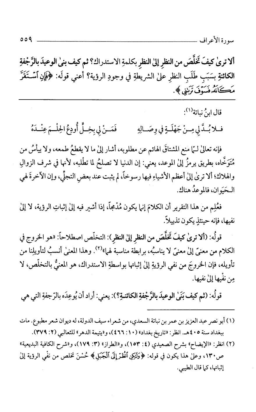 قوله: (ألا ترى كيف تخلص من النظر إلى النظر): التخلص اصطلاحاً: "هو الخروج في الكلام من معنى إلى معنى لا يناسبه، برابطة مناسبة لهما". وهذا المعنى أنسب لتأويلنا من تأويله، فإن الخروج من نفي الرؤية إلى إثباتها بواسطة الاستدراك، هو المعنى بالتخلص، لا من نفيها إلى نفيها.