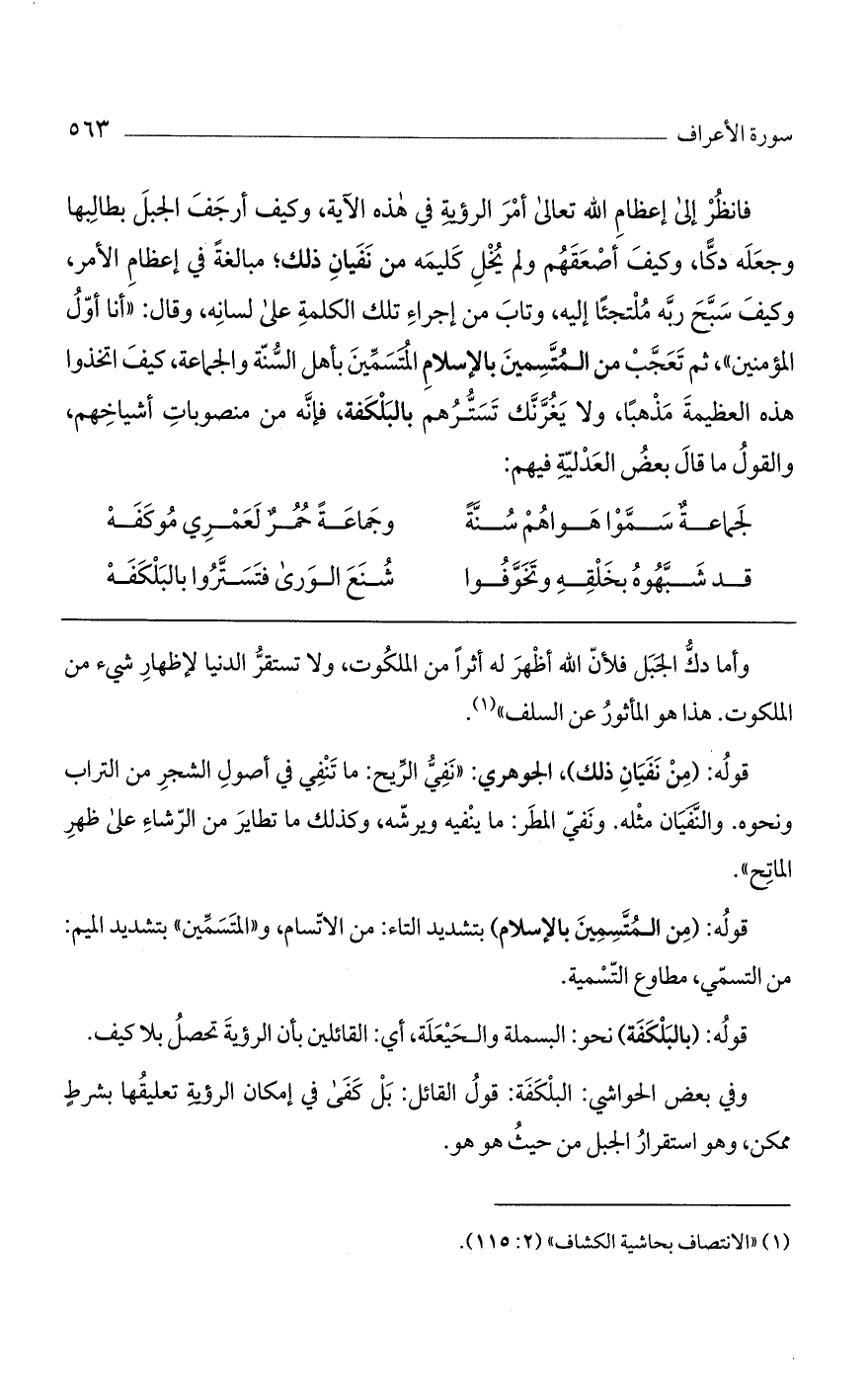 فانظر إلى إعظام الله تعالى أمر الرؤية في هذه الآية، وكيف أرجف الجبل بطالبيها وجعله دكاً، وكيف أصعقهم ولم يخل كليمه من نفيان ذلك؛ مبالغةً في إعظام الأمر، وكيف سبح ربه ملتجئاً إليه، وتاب من إجراء تلك الكلمة على لسانه، وقال: "أنا أول المؤمنين"، ثم تعجب من المتسمين بالإسلام المتسمين بأهل السنة والجماعة، كيف اتخذوا هذه العظيمة مذهباً، ولا يغرنك تسترهم بالبلكفة، فإنه من منصوبات أشياخهم، والقول ما قال بعض العدلية، فيهم: