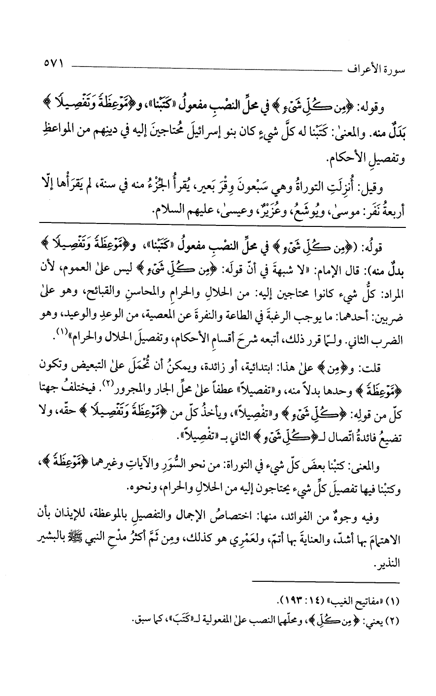 قوله: ((من كل شيءٍ) في محل النصب مفعول "كتبنا"، و (موعظة وتفصيلاً) بدل منه): قال الإمام: "لا شبهة في أن قوله: (من كل شيء) ليس على العموم، لأن المراد: كل شيء كانوا محتاجين إليه: من الحلال والحرام والمحاسن والقبائح، وهو على ضربين: أحدهما: ما يوجب الرغبة في الطاعة والنفرة عن المعصية، من الوعد والوعيد، وهو الضرب الثاني. ولما قرر ذلك، أتبعه شرح أقسام الأحكام، وتفصيل الحلال والحرام".