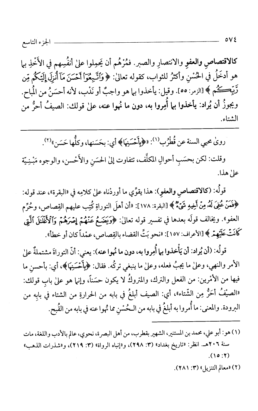 قوله: (كالاقتصاص والعفو): هذا يقوي ما أوردناه على كلامه في "البقرة"، عند قوله: (فَمَنْ عُفِيَ لَهُ مِنْ أَخِيهِ شَيْءٌ) [البقرة: 178]: "أن أهل التوراة كتب عليهم القصاص، وحرم العفو". ويخالف قوله بعدها في تفسير قوله تعالى: (ويَضَعُ عَنْهُمْ إصْرَهُمْ والأَغْلالَ الَّتِي كَانَتْ عَلَيْهِمْ) [الأعراف: 157]: "نحو بت القضاء بالقصاص، عمداً كان أو خطأ".