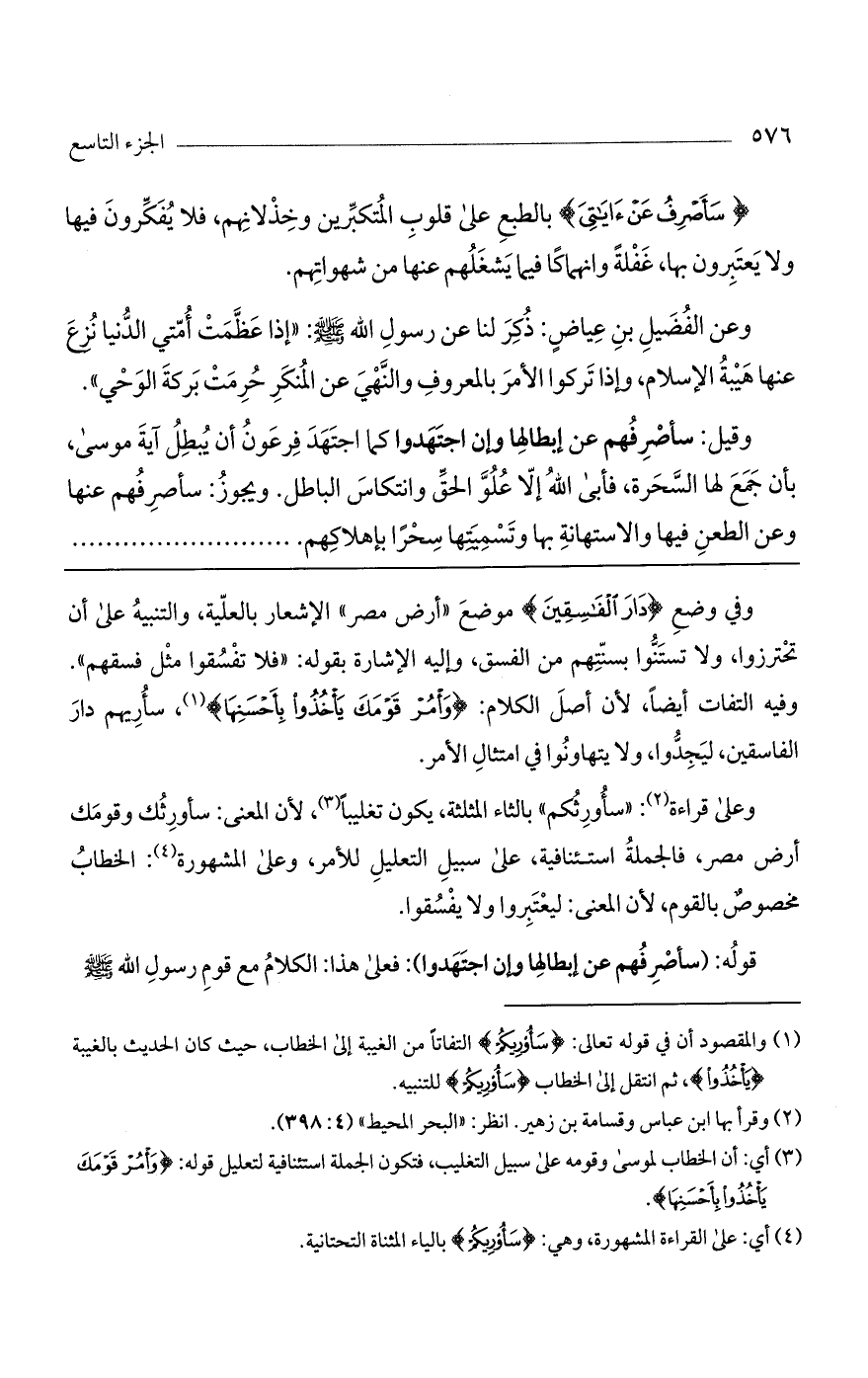 وعلى قراءة: "سأورثكم" بالثاء المثلثة، يكون تغليباً، لأن المعنى: سأورثك وقومك أرض مصر، فالجملة استئنافية، على سبيل التعليل للأمر، وعلى المشهورة: الخطاب مخصوص بالقوم، لأن المعنى: ليعتبروا ولا يفسقوا.