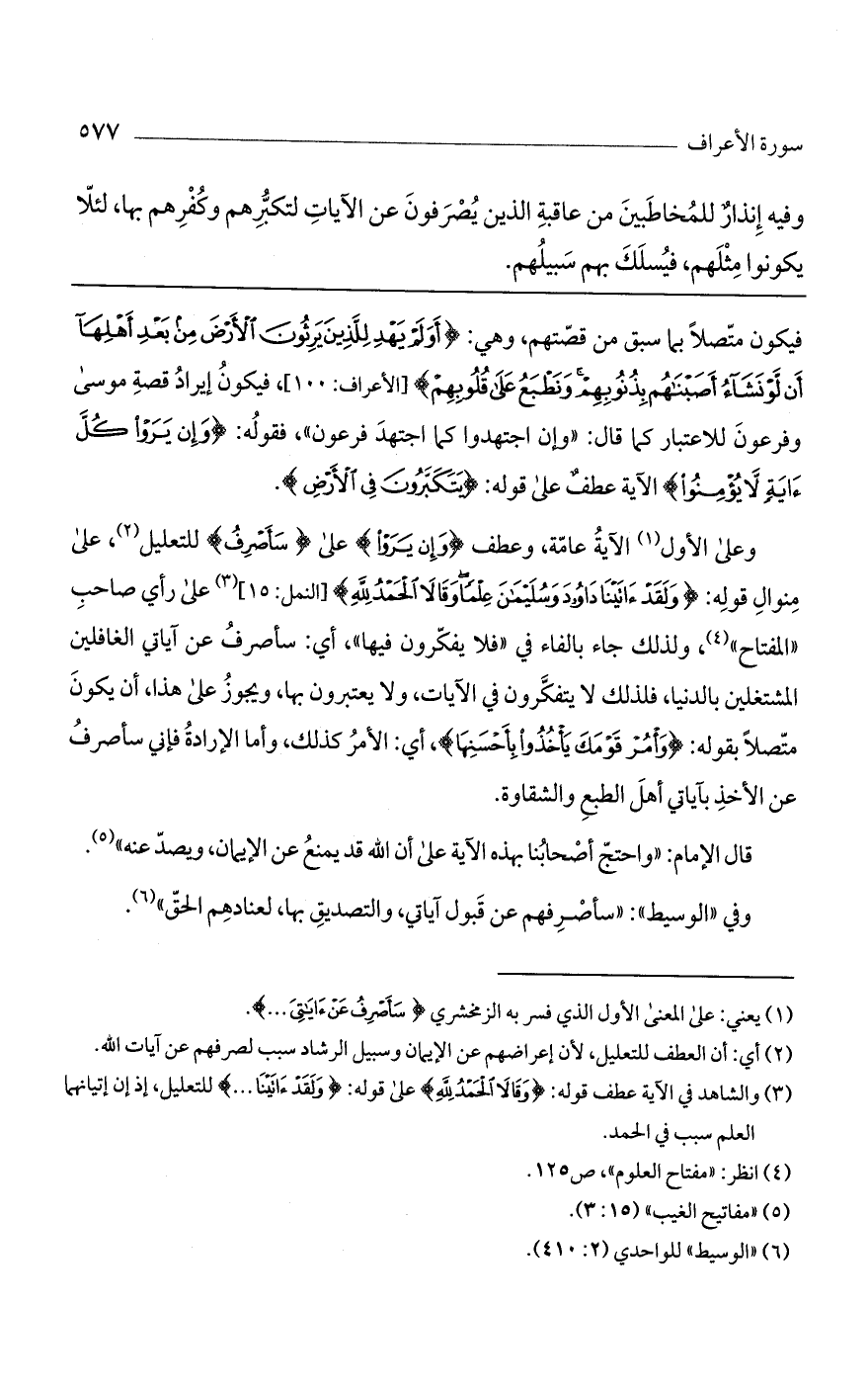 وعلى الأول الآية عامة، وعطف (وإن يروا) على (سأصرف) للتعليل، على منوال قوله: (ولَقَدْ آتَيْنَا دَاوُدَ وسُلَيْمَانَ عِلْمًا وقَالا الحَمْدُ لِلَّهِ) [النمل: 15] على رأي صاحب "المفتاح"، ولذلك جاء بالفاء في "فلا يفكرون فيها"، أي: سأصرف عن آياتي الغافلين المشتغلين بالدنيا، فلذلك لا يتفكرون في الآيات، ولا يعتبرون بها، ويجوز على هذا، أن يكون متصلاً بقوله: (وامُرْ قَوْمَكَ يَاخُذُوا بِأَحْسَنِهَا)، أي: الأمر كذلك، وأما الإرادة فإني سأصرف عن الأخذ بآياتي أهل الطبع والشقاوة.