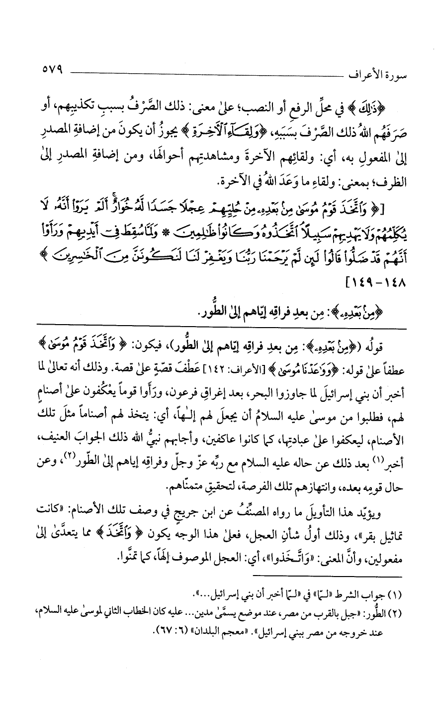 قوله (من بعده): من بعد فراقه إياهم إلى الطور)، فيكون: (واتخذ قوم موسى) عطفاً على قوله: (وواعدنا موسى) [الأعراف: 142] عطف قصةٍ على قصة. وذلك أنه تعالى لما أخبر أن بني إسرائيل لما جاوزوا البحر، بعد إغراق فرعون، ورأوا قوماً يعكفون على أصنام لهم، فطلبوا من موسى عليه السلام أن يجعل لهم إلهاً، أي: يتخذ لهم أصناماً مثل تلك الأصنام، ليعكفوا على عبادتها، كما كانوا عاكفين، وأجابهم نبي الله ذلك الجواب العنيف، أخبر بعد ذلك عن حاله عليه السلام مع ربه عز وجل وفراقه إياهم إلى الطور، وعن حال قومه بعده، وانتهازهم تلك الفرصة، لتحقيق متمناهم.
