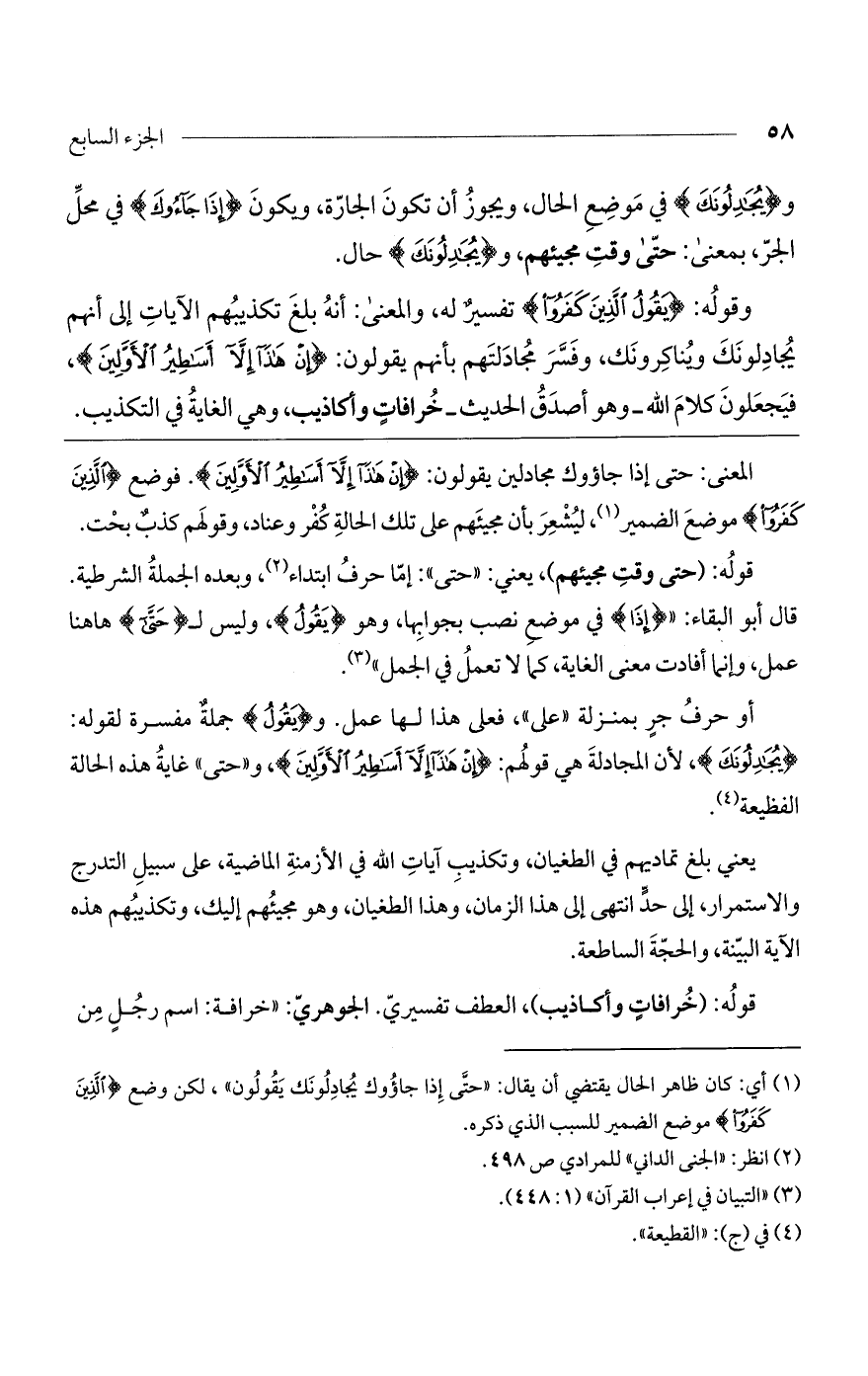 أو حرف جر بمنزلة "على"، فعلى هذا لها عمل. و {يَقُوُل {جملة مفسرة لقوله: {يُجَادِلُونَكَ {، لأن المجادلة هي قولهم: {إنْ هَذَا إلاَّ أَسَاطِيرُ الأَوَّلِينَ {، و"حتى" غايةُ هذه الحالة الفظيعة.