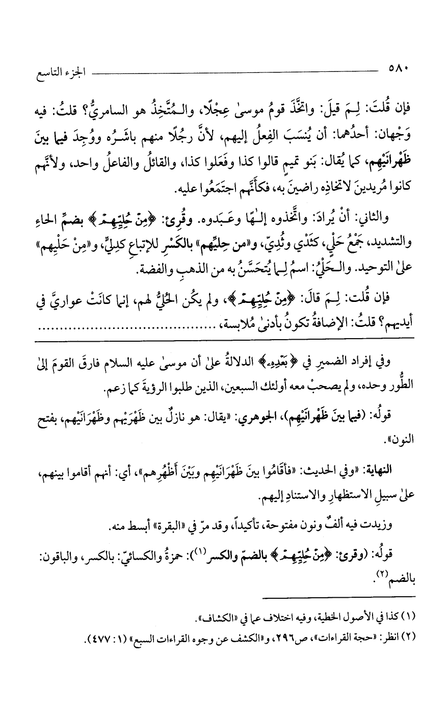 قوله: (وقرئ: (من حليهم) بالضم والكسر): حمزة والكسائي: بالكسر، والباقون: بالضم.