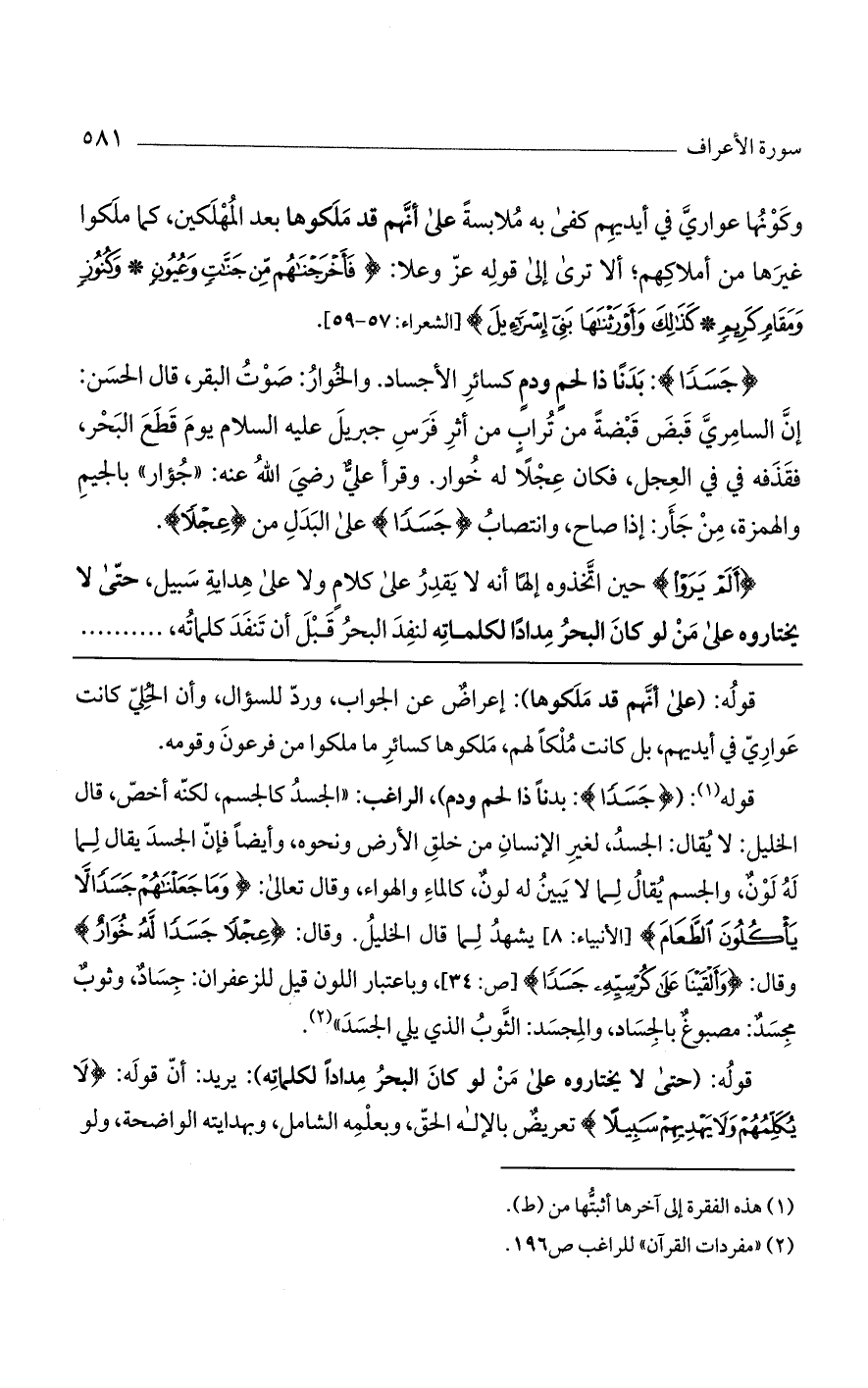 (جَسَداً): بدناً ذا لحم ودم كسائر الأجساد. والخوار: صوت البقر، قال الحسن: إن السامري قبض قبضةً من ترابٍ من أثرِ فرس جبريل عليه السلام يوم قطع البحر، فقذفه في العِجل، فكان عِجلاً له خُوار. وقرأ عليٌّ رضي الله عنه: "جؤار" بالجيم والهمزة، من جأر: إذا صاح، وانتصاب (جَسَدًا) على البدل من (عِجْلاً).