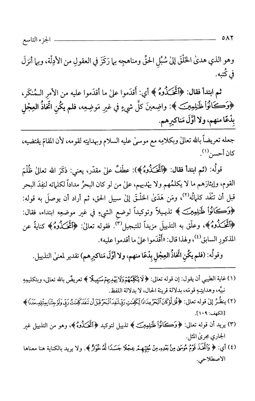 قوله: (ثم ابتدأ فقال: (اتخذوه)): عطف على مقدر، يعني: ذكر الله تعالى ظلم القوم، وإيثارهم ما لا يكلمهم ولا يهديهم، على من لو كان البحر مداداً لكلماته لنفد البحر قبل أن تنفد كلماته، ومن هدى الخلق إلى سبيل الحق، ثم أراد أن يوصل به قوله: (وكانوا ظالمين) تذييلاً وتوكيداً لوضع الشيء في غير موضعه ابتداء، فقال: (اتخذوه)، وعلق به التذييل مزيداً للتبجيل. فقوله تعالى: (اتخذوه) كنايةً عن المذكور السابق، ولهذا قال: "أقدموا على ما أقدموا عليه".