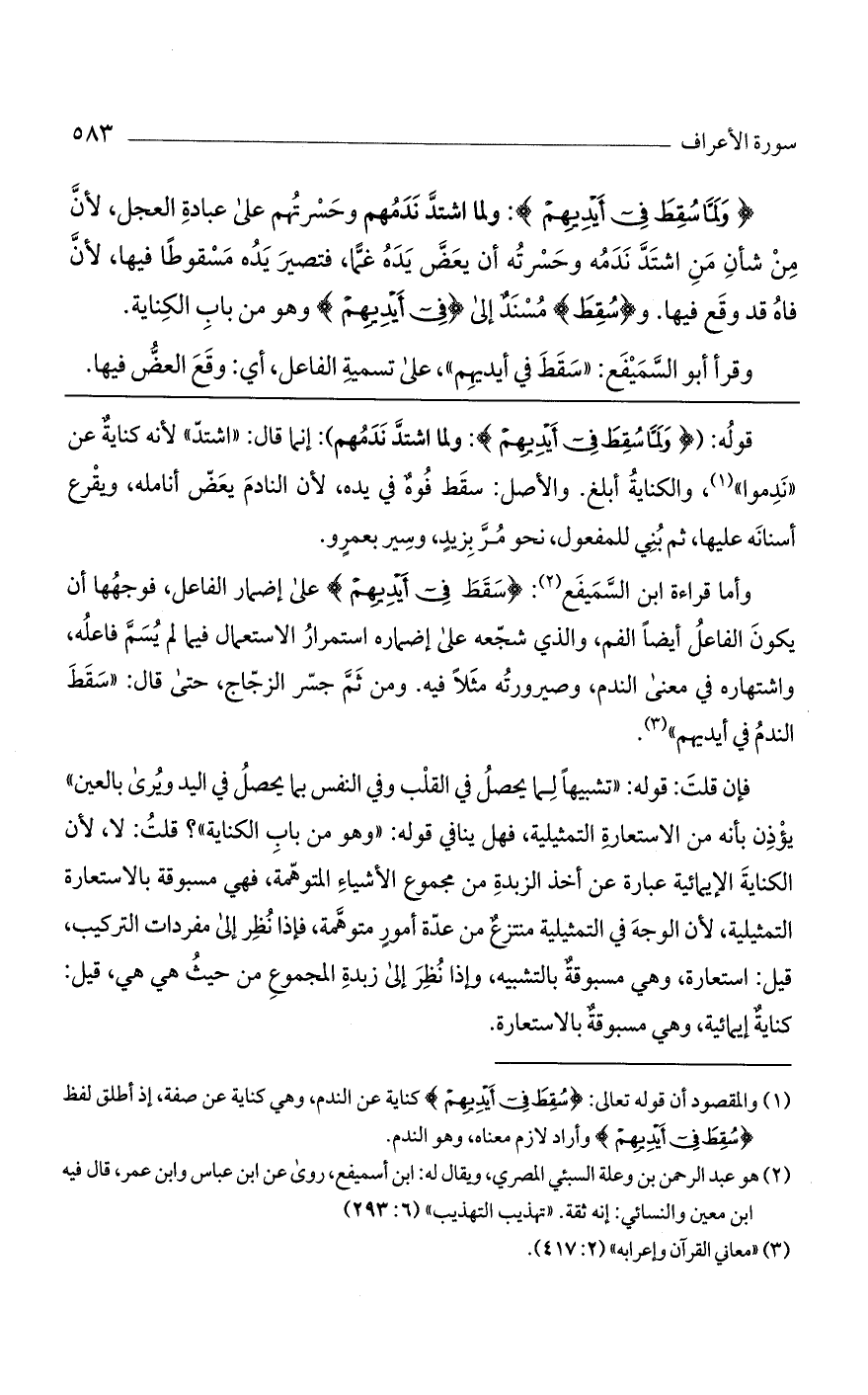(وَلَمَّا سُقِطَ في اَيّدِيِهِمْ): ولما اشتدَّ نَدمهم وحسرتهم على عبادة العجل، لأن من شأن من اشتد ندمه وحسرته أن يعض يده غماً، فتصير يده مسقوطاً فيها، لأن فاه قد وقع فيها. و (سُقط) مسندٌ إلى (في أيديهم) وهو من باب الكناية.