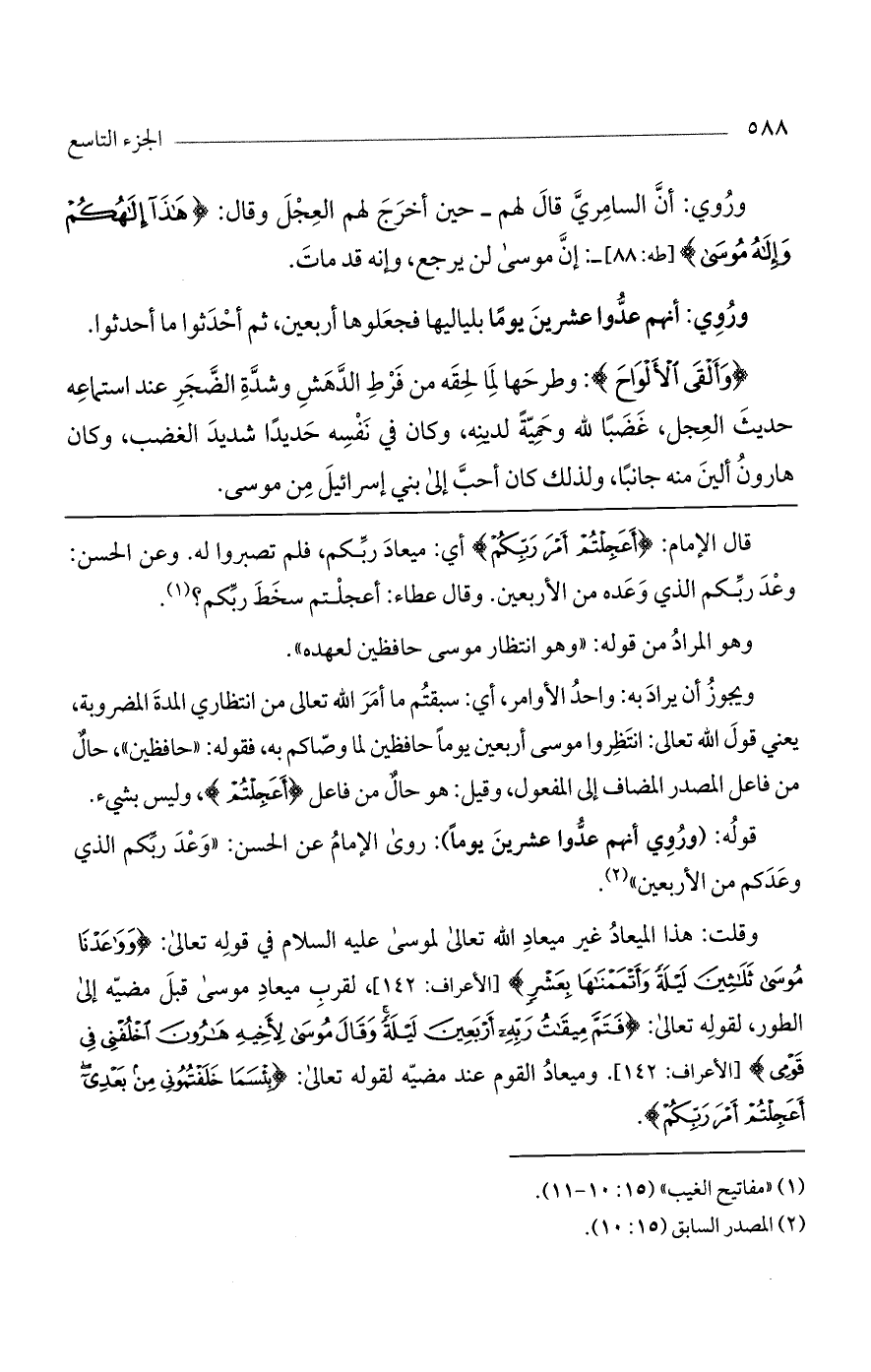 وقلت: هذا الميعاد غير ميعاد الله تعالى لموسى عليه السلام في قوله تعالى: (ووَاعَدْنَا مُوسَى ثَلاثِينَ لَيْلَةً وأَتْمَمْنَاهَا بِعَشْرٍ) [الأعراف: 142]، لقرب ميعاد موسى قبل مضية إلى الطور، لقوله تعالى: (فَتَمَّ مِيقَاتُ رَبِّهِ أَرْبَعِينَ لَيْلَةً وقَالَ مُوسَى لأَخِيهِ هَارُونَ اخْلُفْنِي فِي قَوْمِي) [الأعراف: 142]. وميعاد القوم عند مضية لقوله تعلى: (بِئْسَمَا خَلَفْتُمُونِي مِنْ بَعْدِي أَعَجِلْتُمْ أَمْرَ رَبِّكُمْ).