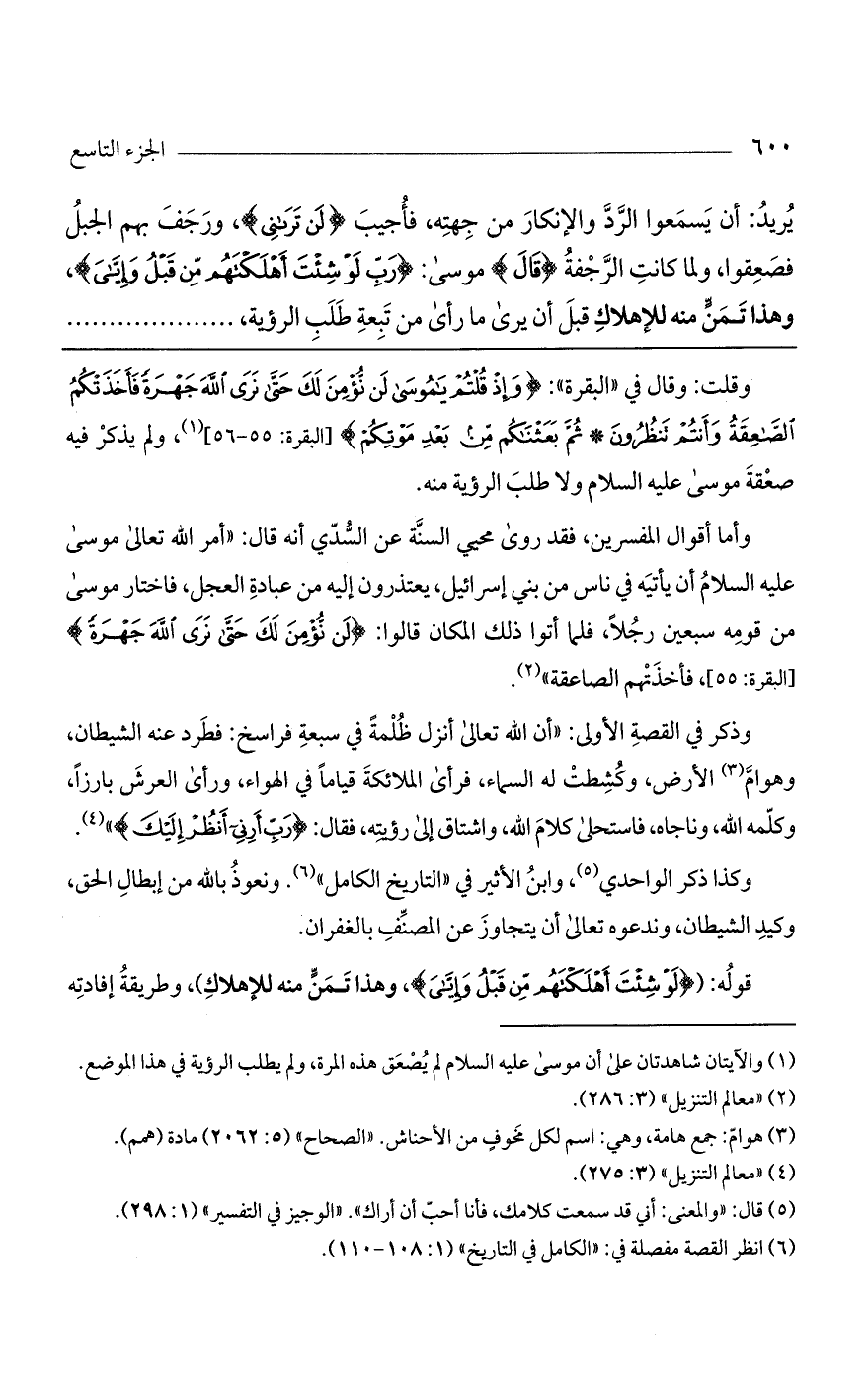 يريد: أن يسمعوا الردّ والإنكار من جهته، فأجيب (لن تراني)، ورجف بهم الجبل فصعقوا. ولما كانت الرجعة (قالَ) موسى: (رَبِّ لَوْ شِئْتَ أَهْلَكْتَهُمْ مِنْ قَبْلُ وَإِيَّايَ)، وهذا تمنٍّ منه للإهلاك قبل أن يرى ما رأي: من تبعة طلب الرؤية، .........