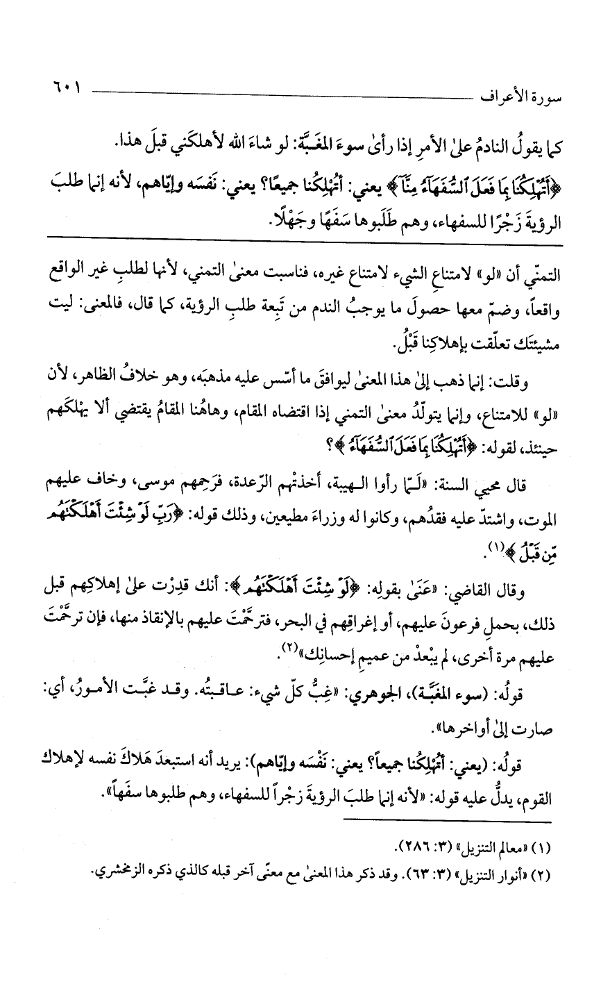وقلت: إنما ذهب إلى هذا المعنى ليوافق ما أسس عليه مذهبه، وهو خلاف الظاهر، لأن "لو" للامتناع، وإنما يتولد معنى التمني إذا اقتضاه المقام، وهاهنا المقام يقتضي ألا يهلكهم حينئذ، لقوله: (أَتُهْلِكُنَا بِمَا فَعَلَ السُّفَهَاءُ)؟