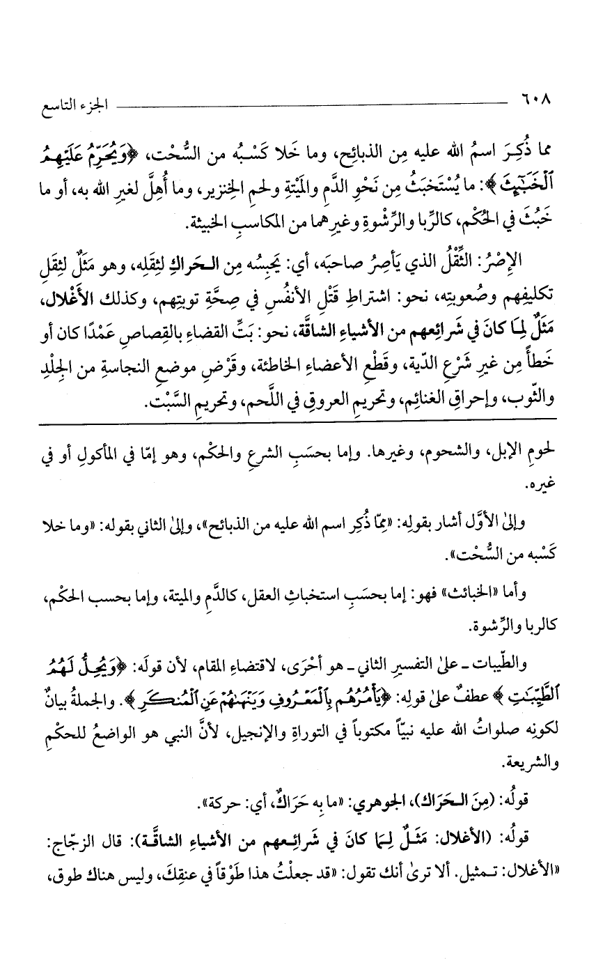 مما ذُكر اسم الله عليه من الذبائح، وما خلى كسبه من السحت، (وَيُحَرِّمُ عَلَيْهِمُ الْخَبائِثَ): ما يستخبث من نحو الدم والميتة ولحم الخنزير، وما أُهِلّ لغير الله به، أو ما خبث في الحكم، كالربا والرشوة وغيرهما من المكاسب الخبيئة.
