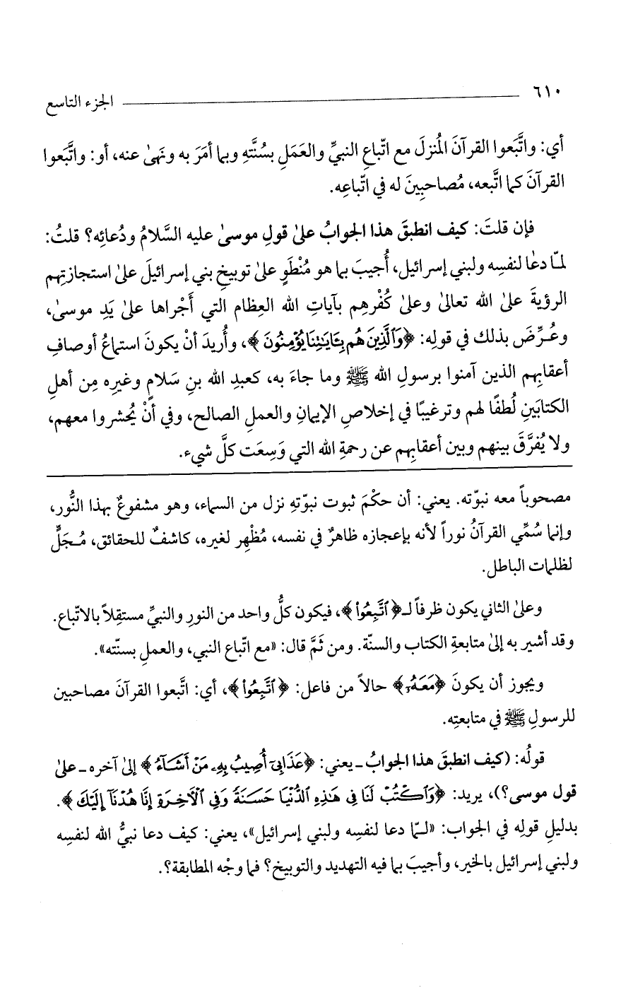وعلى الثاني يكون ظرفاً لـ (اتبعوا)، فيكون كل واحد من النور والنبي مستقلاً بالإتباع. وقد أشير به إلى متابعة الكتاب والسنة. ومن ثم قال: "مع إتباع النبي، والعمل بسنته".