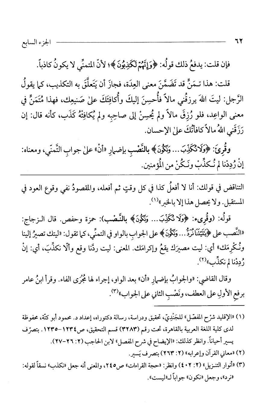 قوله: (وقرئ: {وَلاَ تُكَذْبَ .... وَنكُونَ {بالنصب): حمزة وحفص. قال الزجاج: "النصب على {يَا لَيْتَنَا نُرَدُّ ... ونكون {على الجواب بالواو في التمني، كما تقول: "ليتك تصير إلينا ونكرمك" أي: ليت مصيرك يقع وإكرامك. المعنى: ليت ردنا وقع وألا نكذب، أي: إن رددنا لم نكذب".