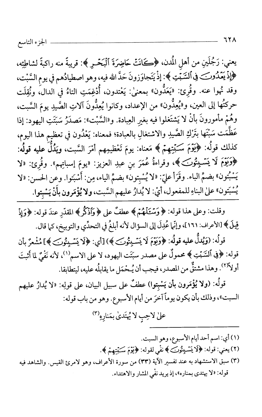 قوله: (ويدل عليه قوله: (ويوم لا يسبتون)) [أي: (لا يسبتون)] مشعر بأن قوله: (في السبت) محمول على مصدر سبتت اليهود، لا على الاسم، لأنه نفي لما أثبت أولاً. وهذا مشتق من المصدر، فيجب أن يحمل ما يقابله عليه، ليتطابقا.