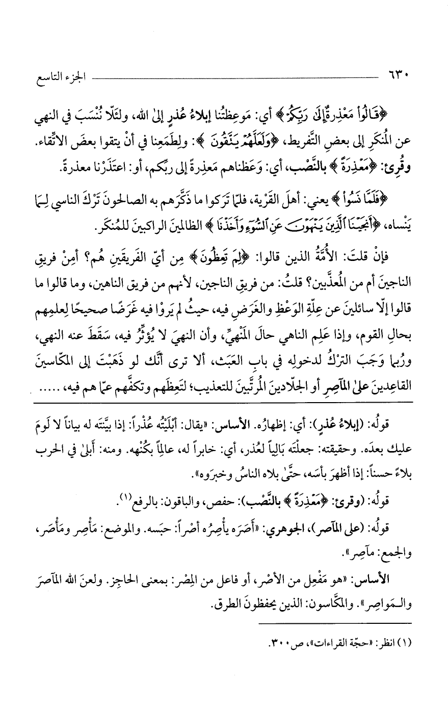 قوله: (وقرئ: (معذرةً) بالنصب): حفص، والباقون: بالرفع.