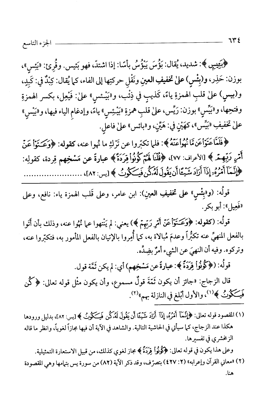 (بَئِيسٍ): شديد، يقال: بؤس يبؤس بأساً، إذا اشتدّ، فهو بئيس. وقرئ: "بئسٍ"، بوزن حَذِر. و (بئسٍ) على تخفيف العين ونقل حركتها إلى الفاء، كما يقال: كبدٌ في كبدٍ، و (بيسٍ) على قلب الهمزة ياءً، كذيبٍ في ذئب، و"بيئسٍ" على: فيعل، بكسر الهمزة وفتحها. و"بيسٍ" بوزن ريس، على قلب همزة "بيئسٍ" ياءً، وإدغام الياء فيها، و"بيسٍ" على تخفيف "بيس"، كهينٍ في: هين، و"بائس" على فاعلٍ.