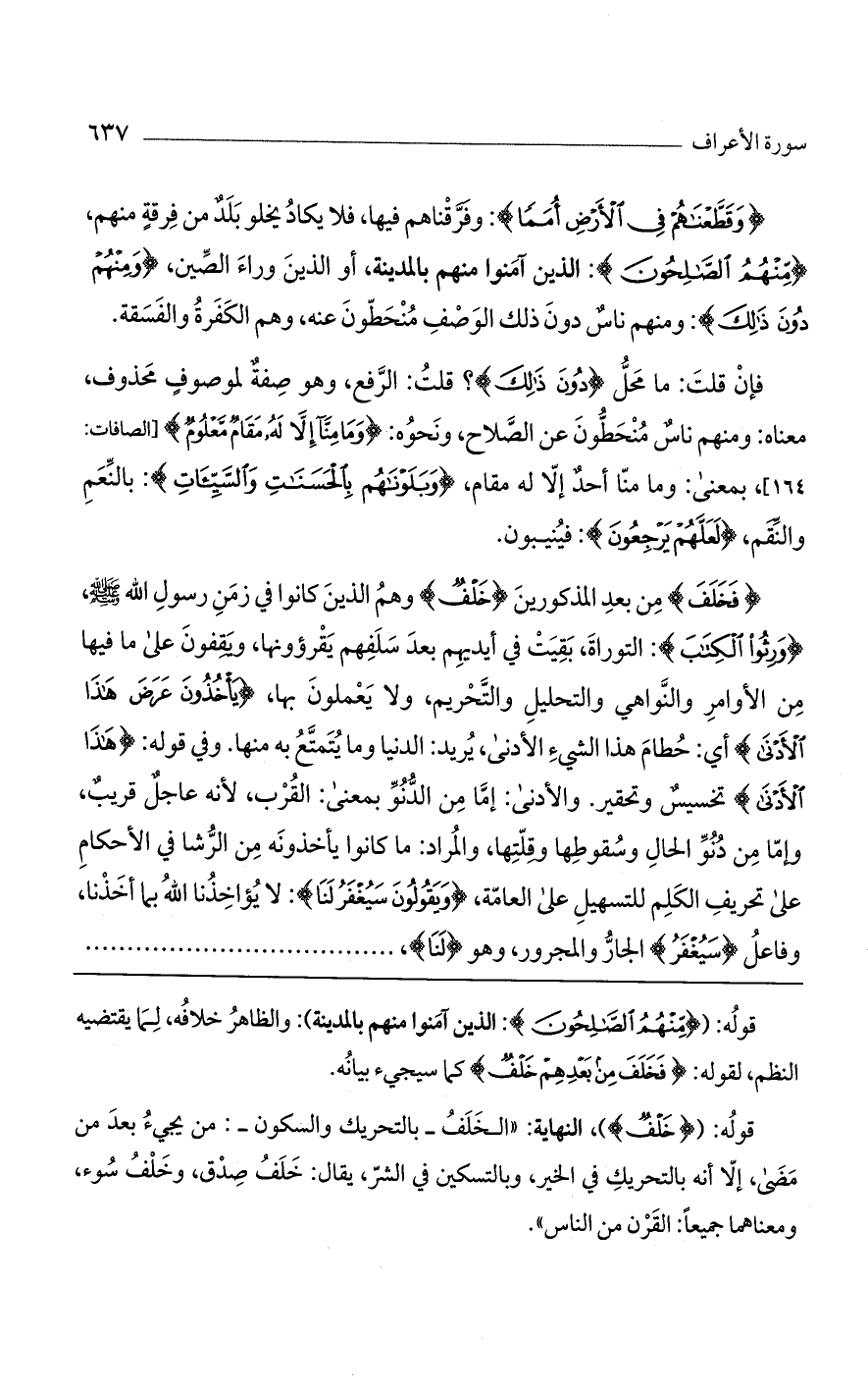(فَخَلَفَ) مِن بعد المذكورين (خَلْفٌ) وهم الذين كانوا في زمن رسول الله صلى الله عليه وسلم، (وَرِثُوا الْكِتابَ): التوراة، بقيت في أيديهم بعد سلفهم يقرؤونها، ويقفون على ما فيها من الأوامر والنواهي والتحليل والتحريم، ولا يعملون بها، (يَاخُذُونَ عَرَضَ هذَا الْأَدْنى) أي: حطام هذا الشيء الأدنى، يريد: الدنيا وما يتمتع به منها. وفي قوله: (هذَا الْأَدْنى) تخسيسٌ وتحقير. والأدنى: إما من الدنوّ بمعنى: القرب، لأنه عاجلٌ قريبٌ، وإما من دُنوّ الحال وسقوطها وقلتها، والمراد: ما كانوا يأخذونه من الرشا في الأحكام على تحريف الكلم للتسهيل على العامة، (وَيَقُولُونَ سَيُغْفَرُ لَنا): لا يؤاخذنا الله بما أخذنا، وفاعلُ (سَيُغْفَرُ) الجار والمجرور، وهو (لَنا)،