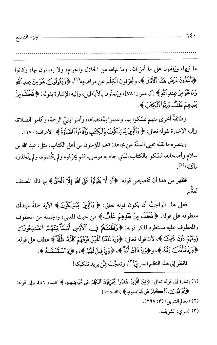 وينصره ما نقله محيي السنة عن مجاهد: "هم المؤمنون من أهل الكتاب، مثل: عبد الله بن سلام وأصحابه، تمسكوا بالكتاب الذي جاء به موسى، فلم يحرفوه، ولم يكتموه، ولم يتخذوه مأكلة".