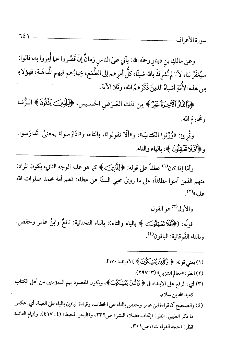 وعن مالك بن دينارٍ رحمه الله، يأتي على الناس زمانٌ إن قصروا عما أُمروا به، قالوا: سيغفر لنا، لأنا لم نشرك بالله شيئاً، كل أمرهم إلى الطمع، خيارهم فيهم المداهنة، فهؤلاء من هذه الأمّة أشباه الذين ذكرهم الله، وتلا الآية.
