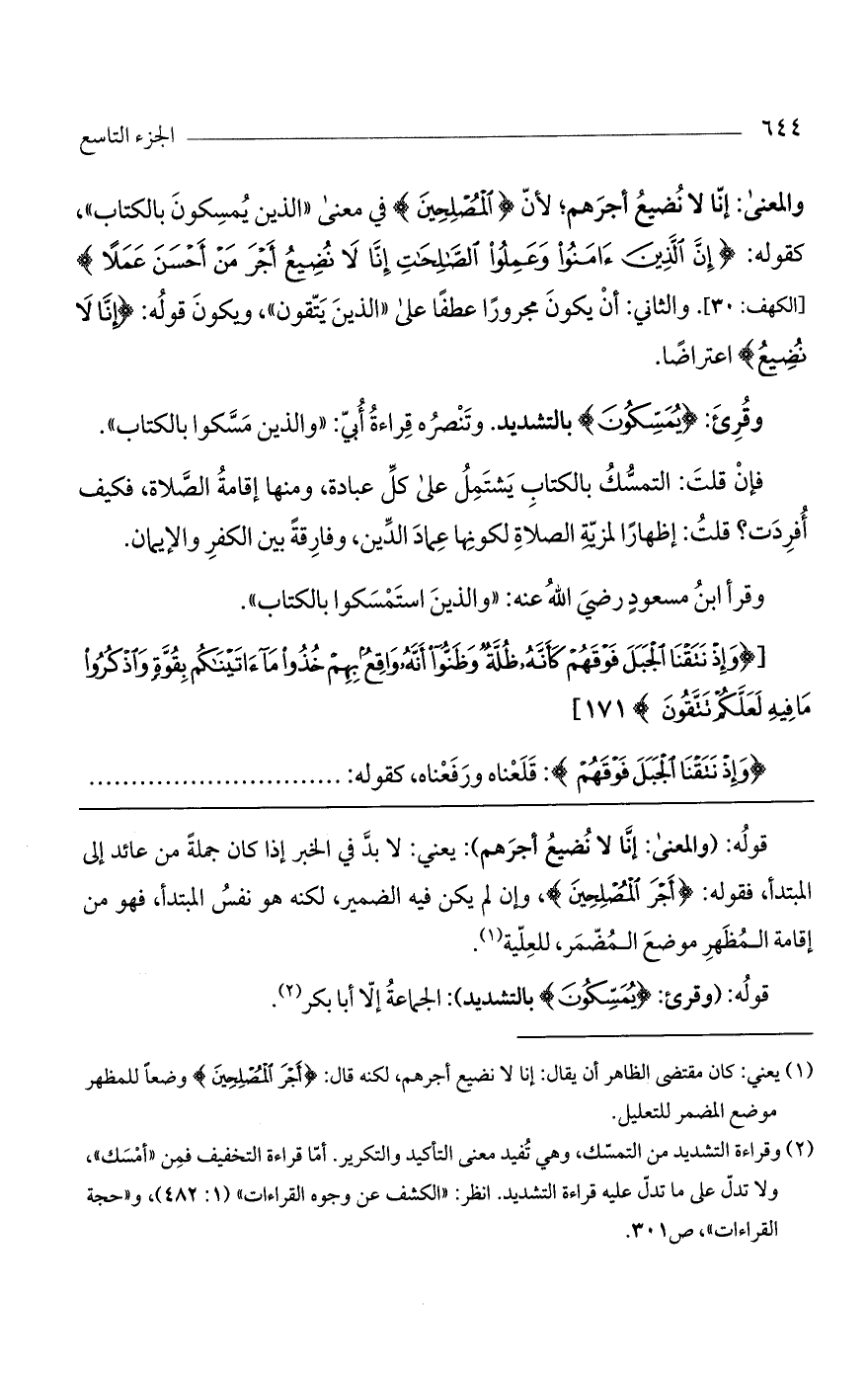 والمعنى: إنا لا نضيع أجرهم، لأنّ (المصلحين) في معنى "الذين يمسكون بالكتاب"، كقوله: (إِنَّ الَّذِينَ آمَنُوا وَعَمِلُوا الصَّالِحاتِ إِنَّا لا نُضِيعُ أَجْرَ مَنْ أَحْسَنَ عَمَلًا) [الكهف: 30]. والثاني: أن يكون مجروراً عطفاً على "الذين يتقون"، ويكون قوله: (إِنَّا لا نُضِيعُ) اعتراضاً.